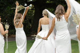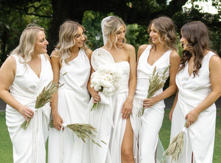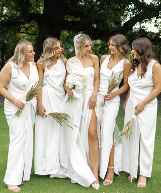 Liana's bridesmaids dressed all in different One Fell Swoop signature styles, made in Ivory Crepe.