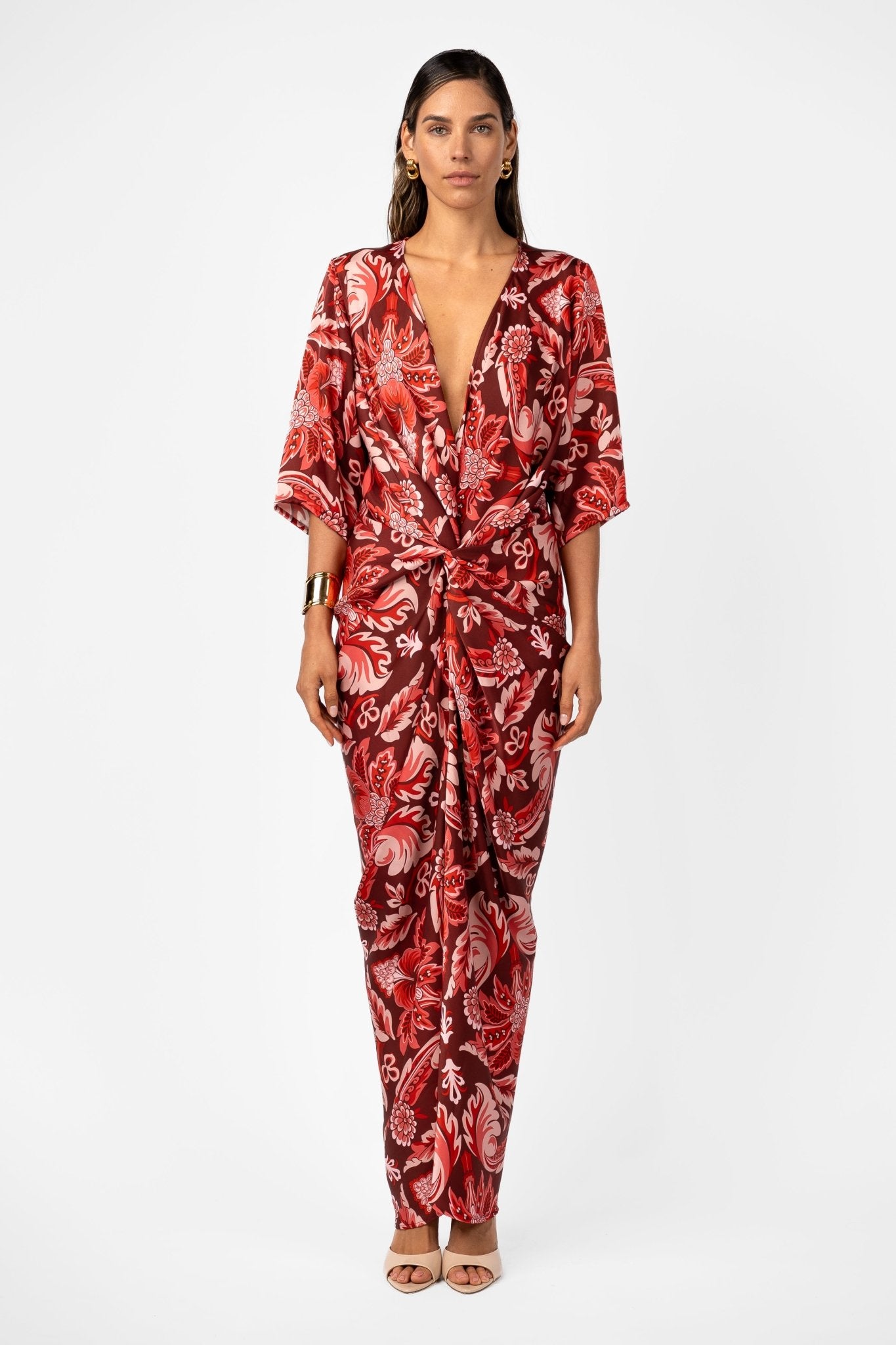 The signature wrap front forms a soft plunge V neckline that can be secured and adjusted to suit the wearer’s preference. Relaxed kimono sleeves fall to the elbow, balancing the silhouette with fluid structure. The twist detail gathers at the waist, sculpting the form before releasing into a straight maxi skirt with subtle back split for ease of movement.