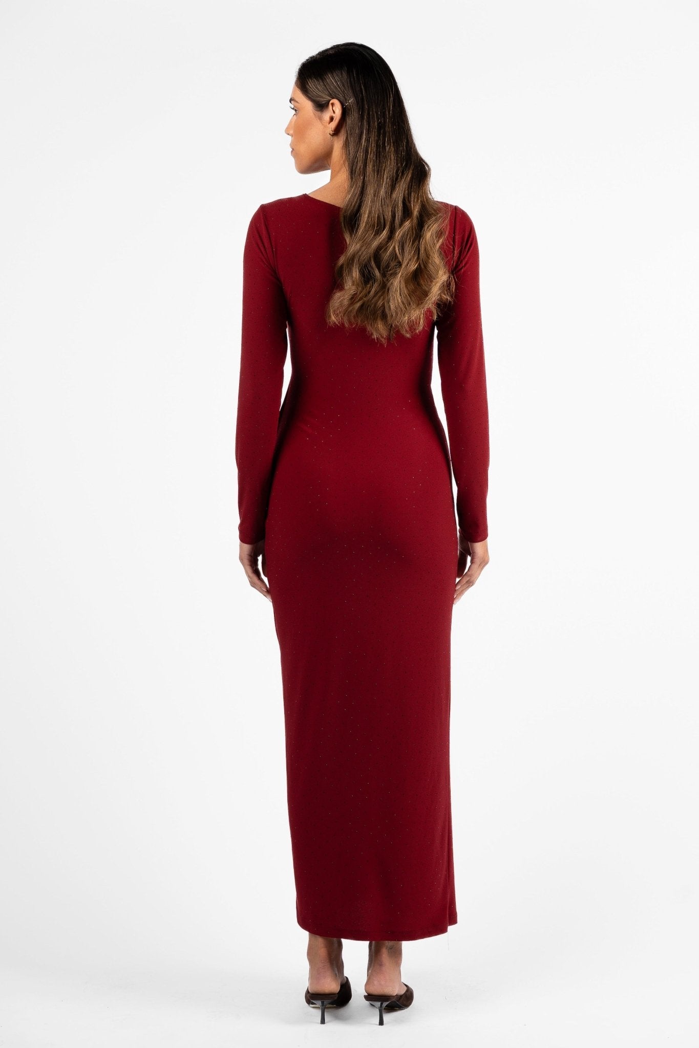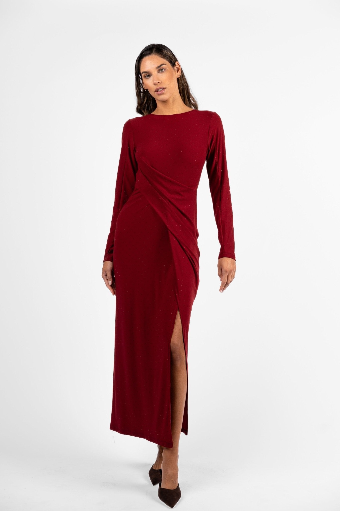 Cut with a round neckline and fitted long sleeves, the design balances a refined upper bodice with fluid drape through the midsection. The asymmetric folds move diagonally across the torso, shaping the waist and hip while enhancing the natural line of the body. A front left slit introduces ease of movement and a subtle sense of drama to the otherwise streamlined silhouette.