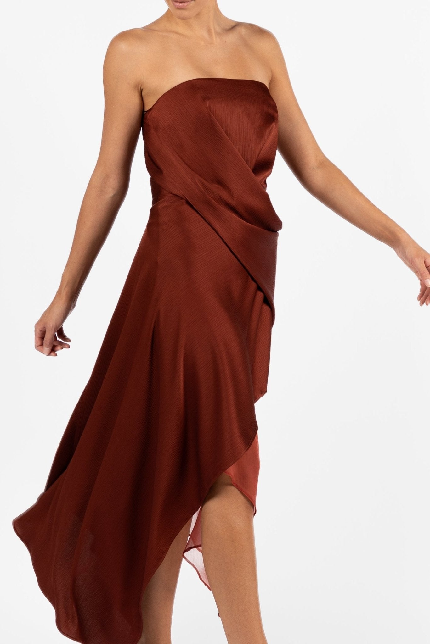 The Echelon Dress in Terra Rosa is designed as a movement piece, balancing sculptural structure with fluid drape. Cut in a rich rust-toned satin with a sheer tonal underlayer, the silhouette wraps and folds across the body to create a modern, directional shape.