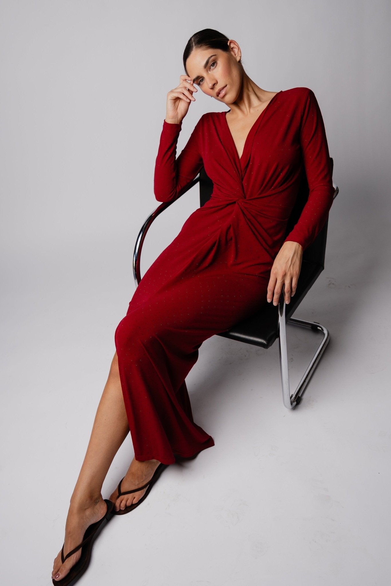 The deep V neckline frames the décolletage and can be adjusted to suit the wearer’s preference. The twist detail gathers through the centre front, sculpting the waist before falling into a fluid, elongated skirt. Long fitted sleeves balance the silhouette with clean structure. Crafted in stretch jersey with no zip, the dress slips on effortlessly and contours the body while allowing natural movement.