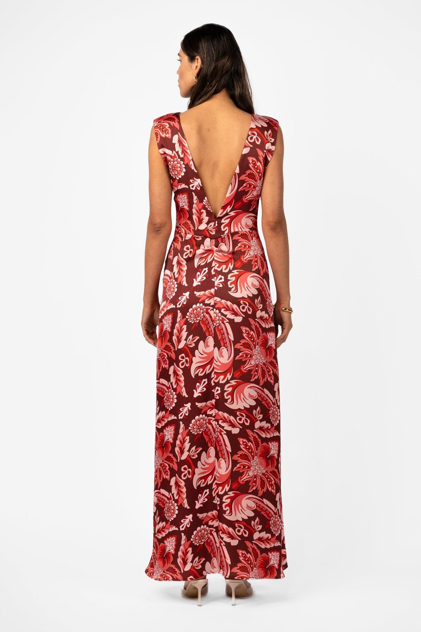 The Lithic Maxi in Porta Rosa is cut in a fluid satin fabrication printed in rich red and blush ornamental florals. Designed with a sculptural draped neckline and clean cap sleeve silhouette, the bodice softly contours the body before falling into an elongated column skirt. The deep V back adds contrast to the high front neckline, balancing coverage with quiet sensuality. Graphic yet refined, this silhouette feels confident and modern while remaining effortless to wear.