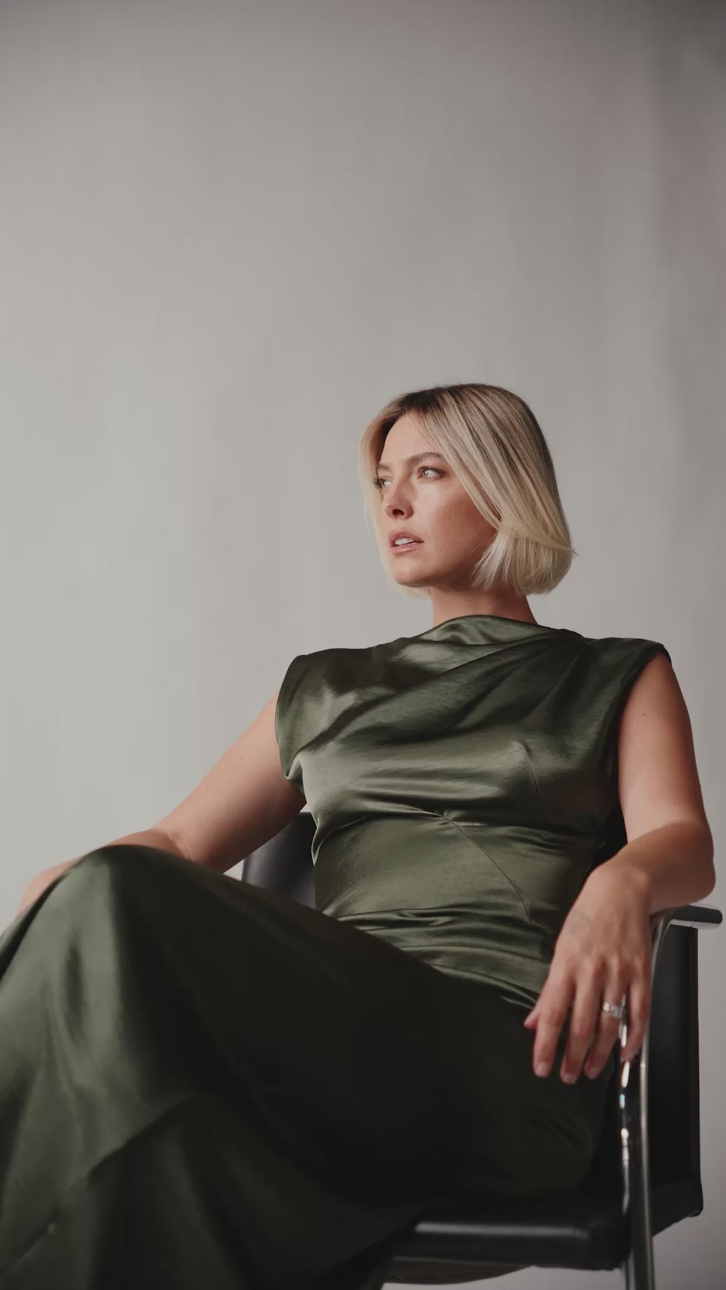 The Lithic Maxi in Thicket is cut in a dense satin with a matte crepe reverse, offering structure and fluidity in equal measure. The richness of the olive tone enhances the sculptural drape through the neckline, allowing the folds to fall with intention and clarity.