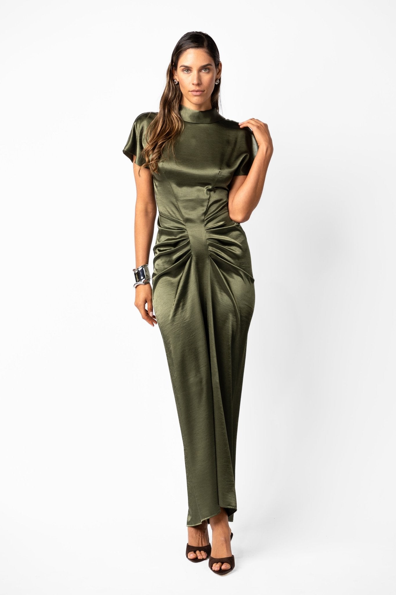 The Lucent Maxi in Satin Thicket is a sculptural evening silhouette defined by precision draping and controlled shine. Cut in a substantial satin with crepe backed construction, the rich olive tone reflects light across the surface while maintaining a dense, supportive feel against the body.