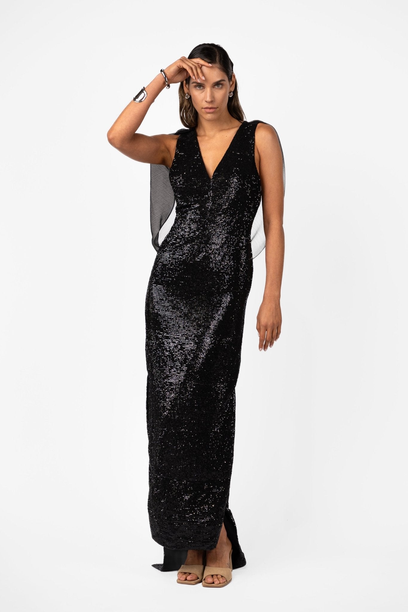 The Velare Maxi in Silhouette Black Sequin is cut in a high shine, densely embellished sequin fabrication designed to command attention with quiet confidence. Sculpted through the bodice with a clean V neckline and fluid drape falling through the skirt, this silhouette elongates the frame while maintaining a refined, effortless edge.