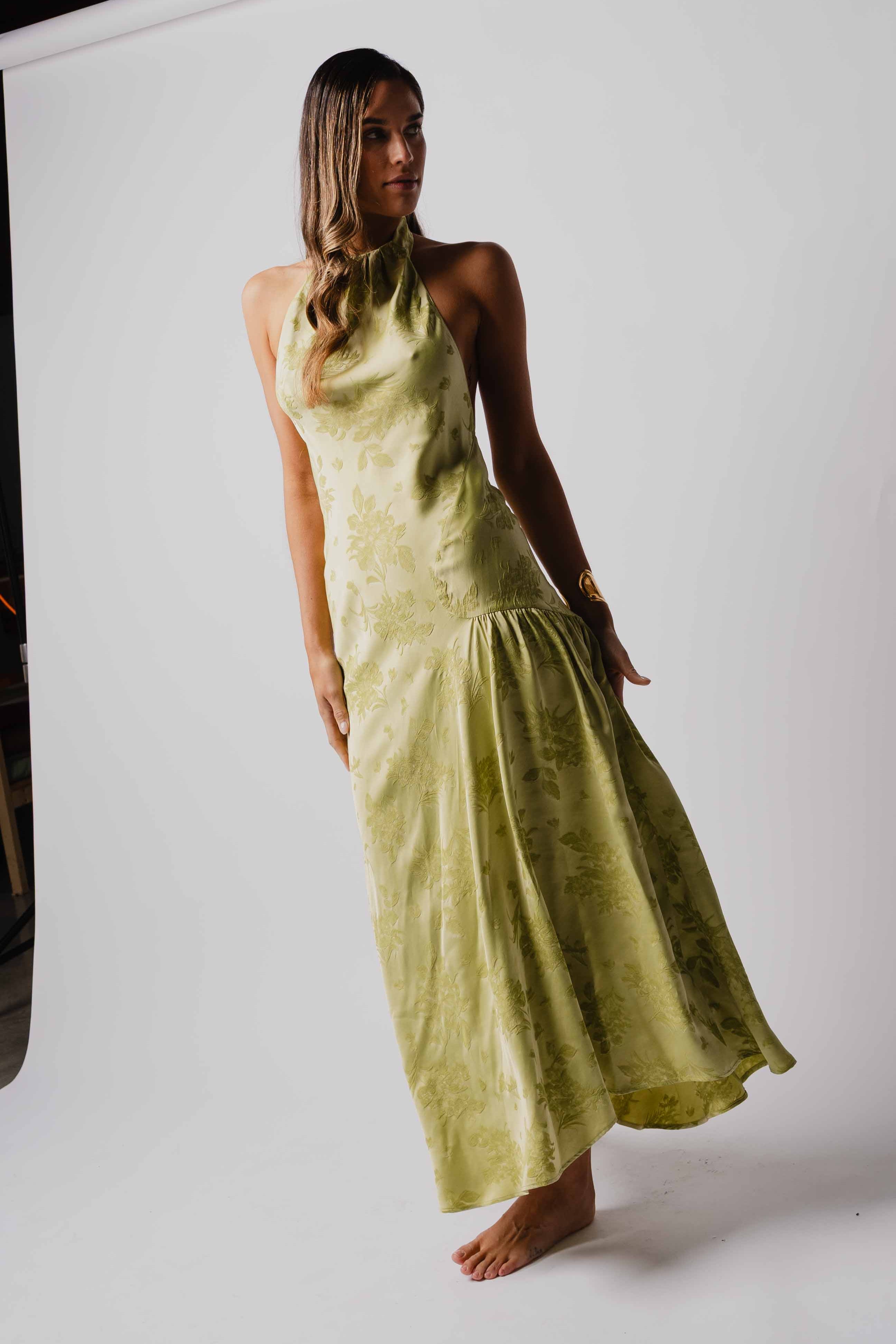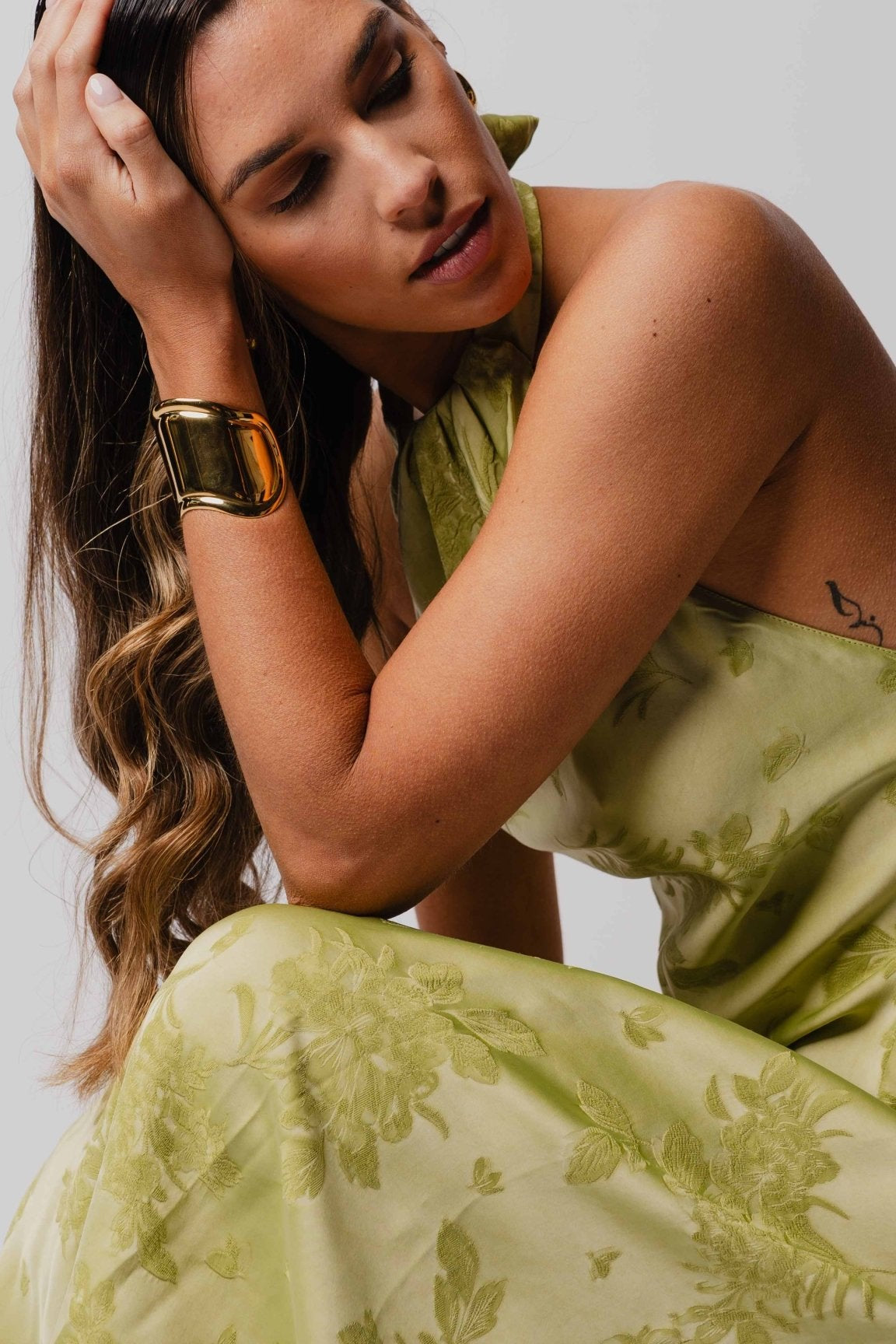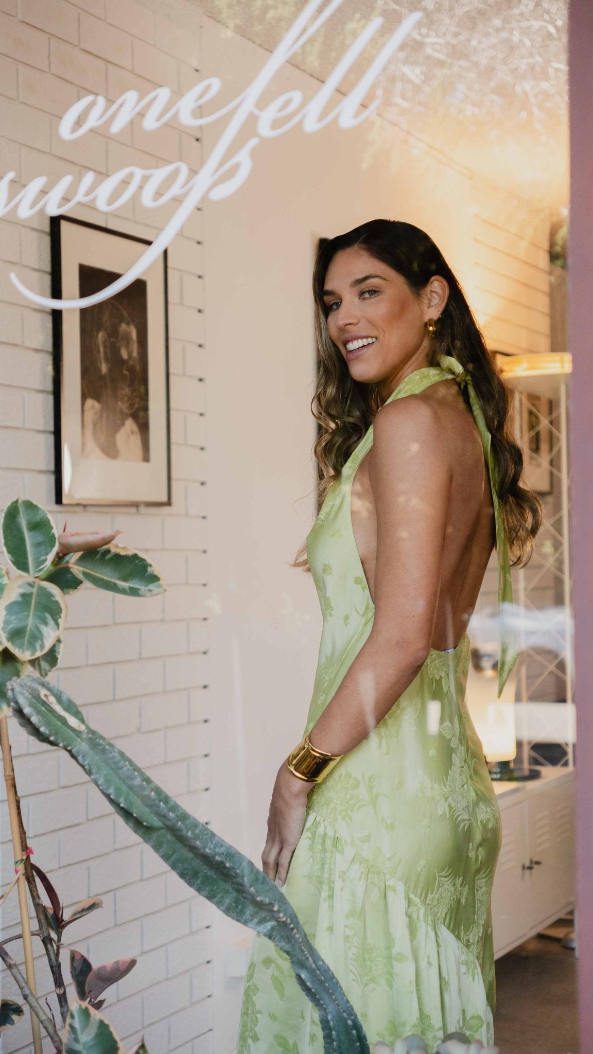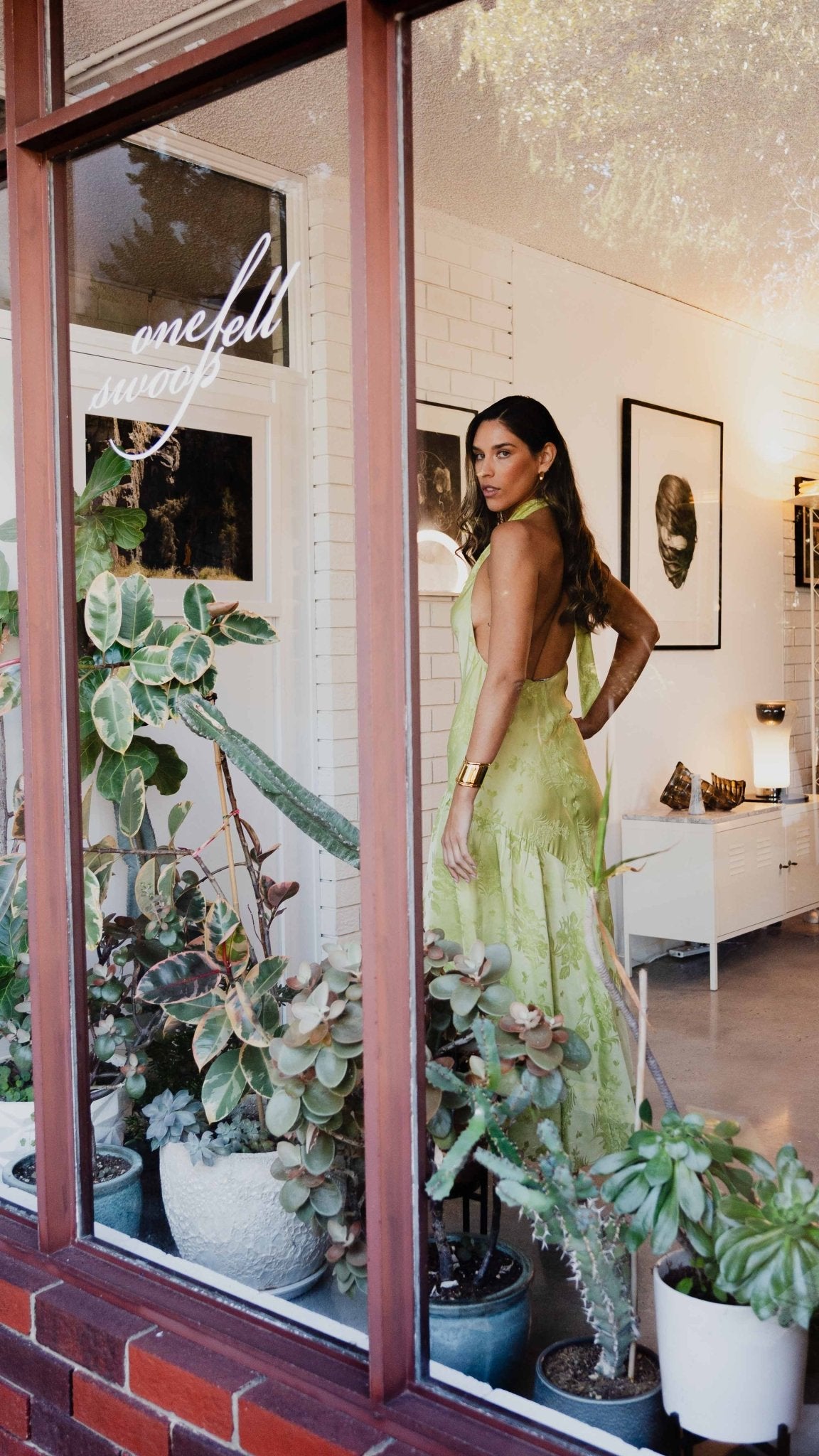 The Faint Slip in Edamame is made from a soft stretch mesh. Designed with an asymmetric neckline and a semi-sheer draped sleeve, the silhouette is fitted through the body with a subtle gathered detail at the bust.