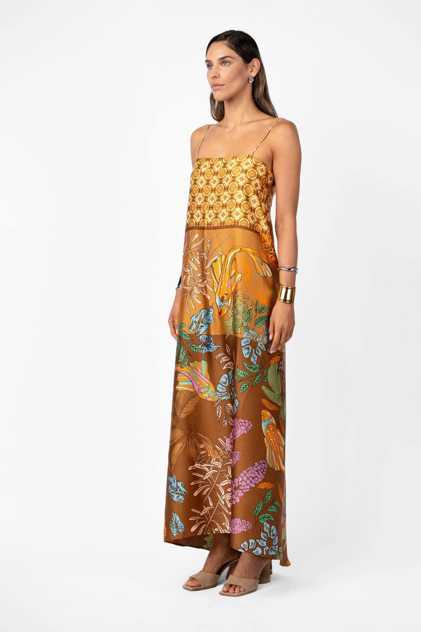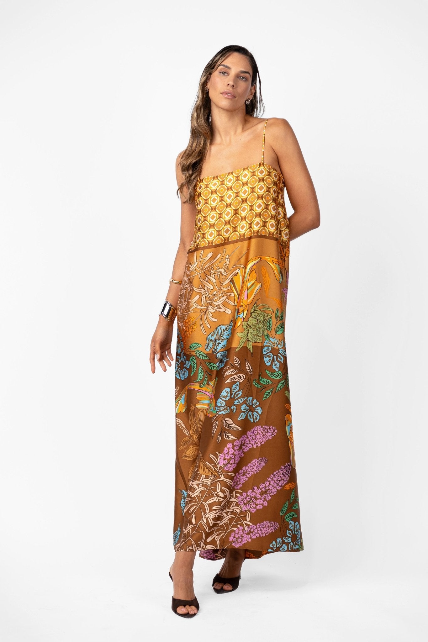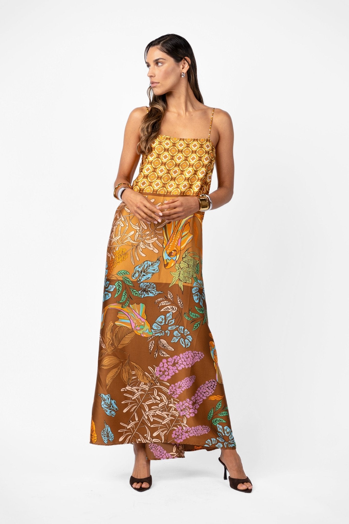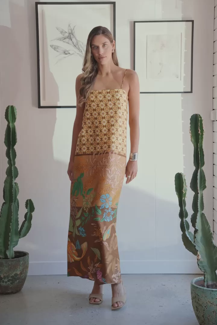 The Duplicity Slip in Koi no Mori is cut from lustrous satin patterned with a richly layered Japanese-inspired print. Delicately suspended from slender rouleau straps, the clean square neckline creates a balanced frame for the fluid silhouette. The slip skims the body with a gentle ease, before falling into a soft, ankle-grazing hem that moves effortlessly with each step.