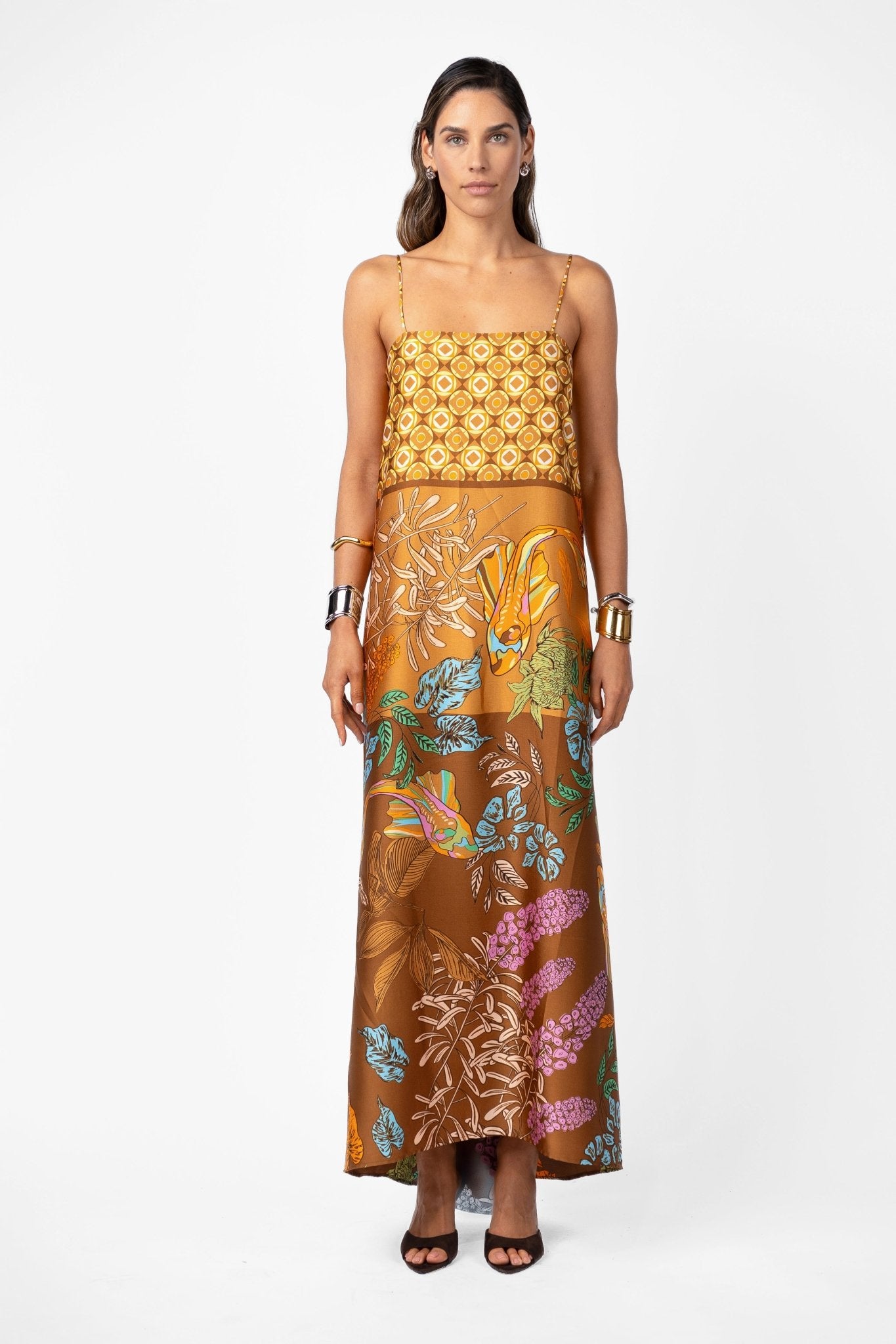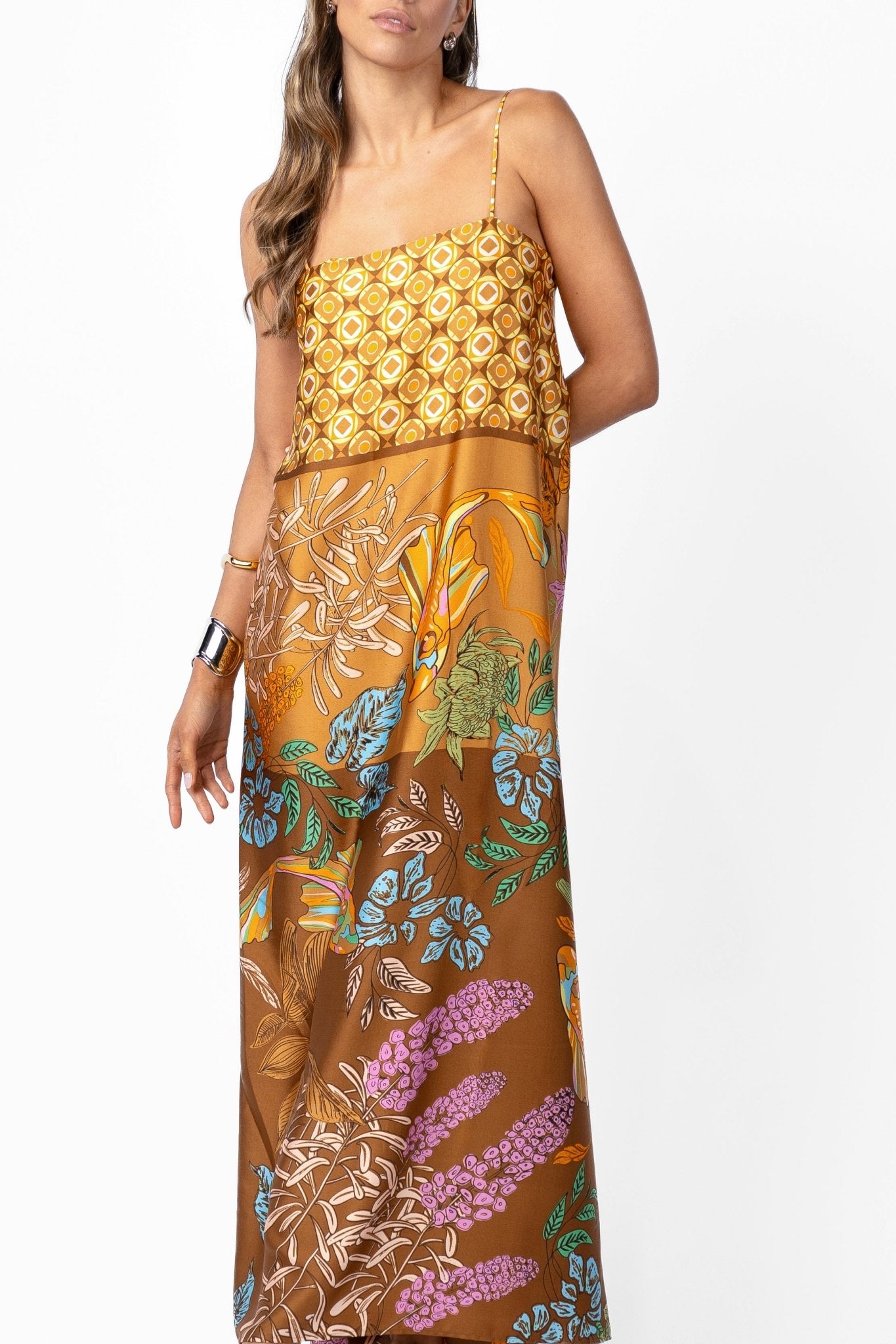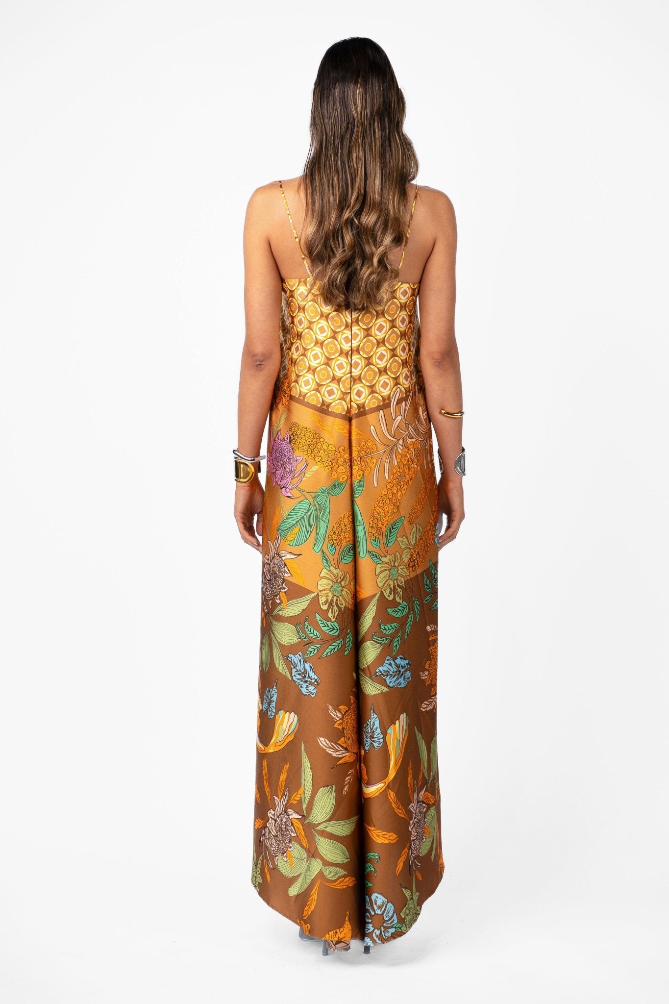 The Duplicity Slip in Koi no Mori is cut from lustrous satin patterned with a richly layered Japanese-inspired print. Delicately suspended from slender rouleau straps, the clean square neckline creates a balanced frame for the fluid silhouette. The slip skims the body with a gentle ease, before falling into a soft, ankle-grazing hem that moves effortlessly with each step.