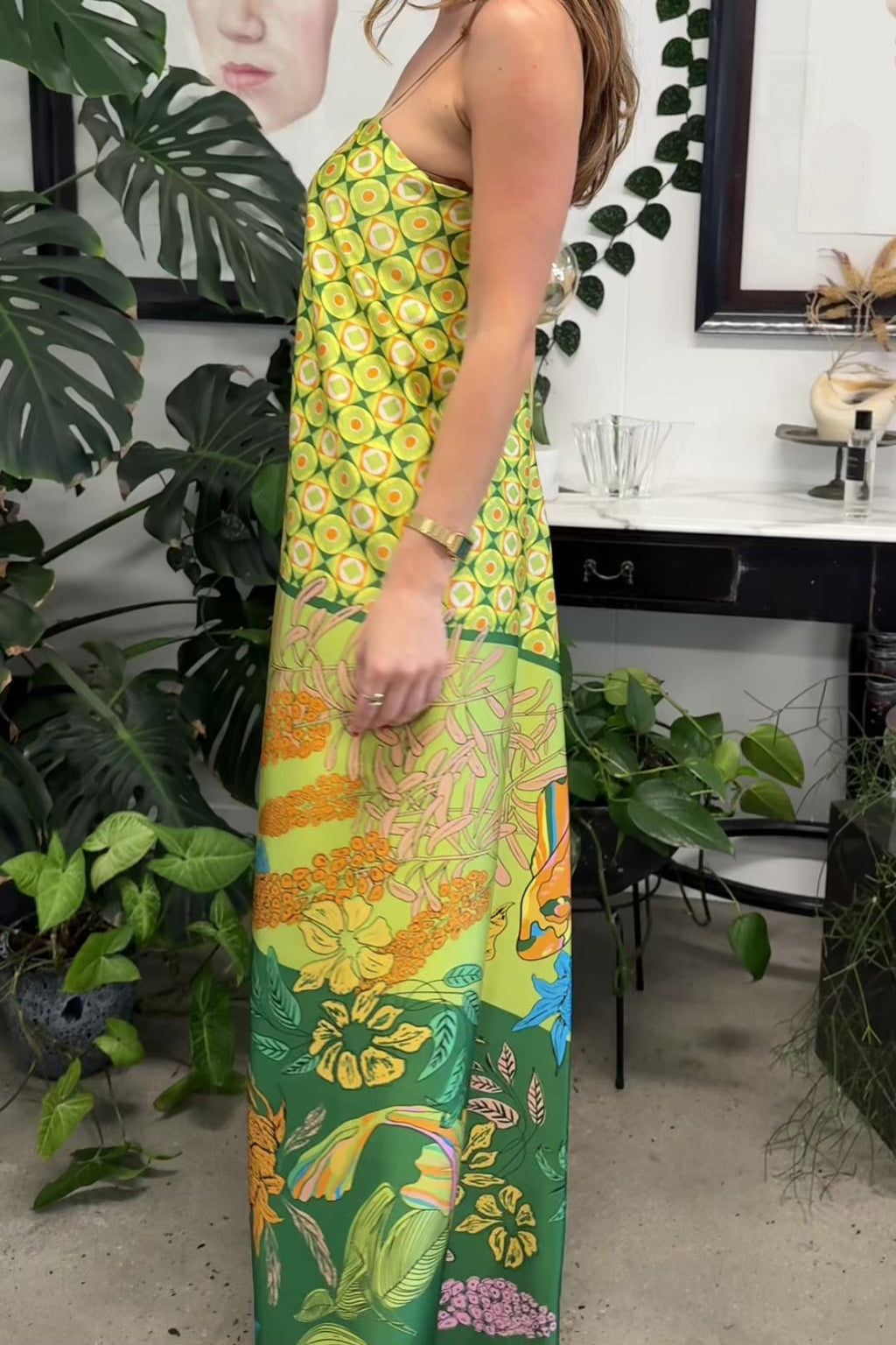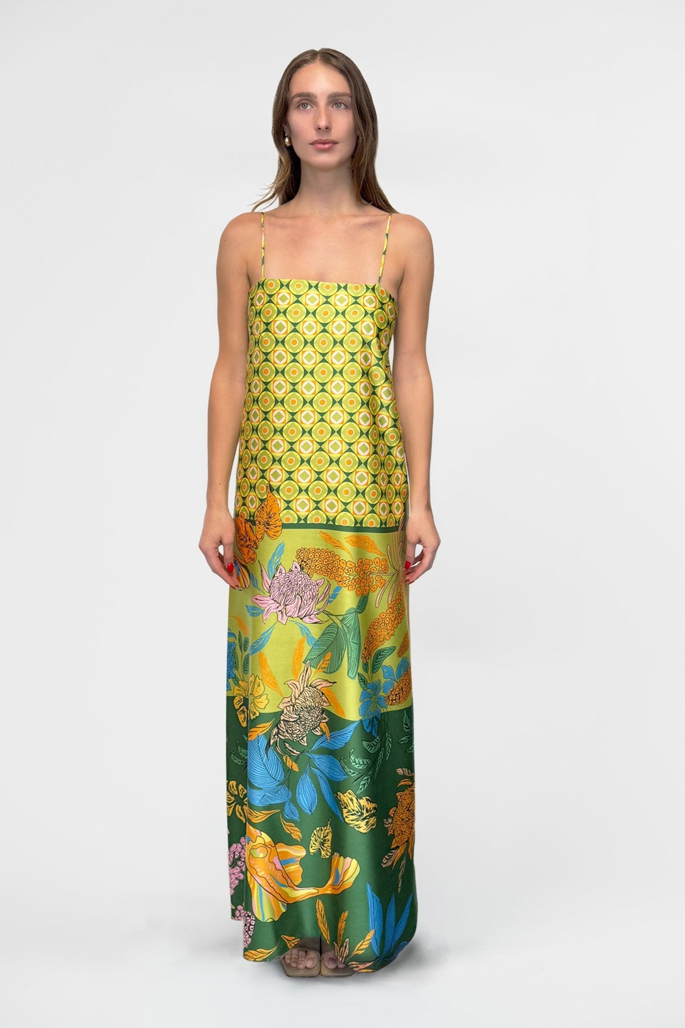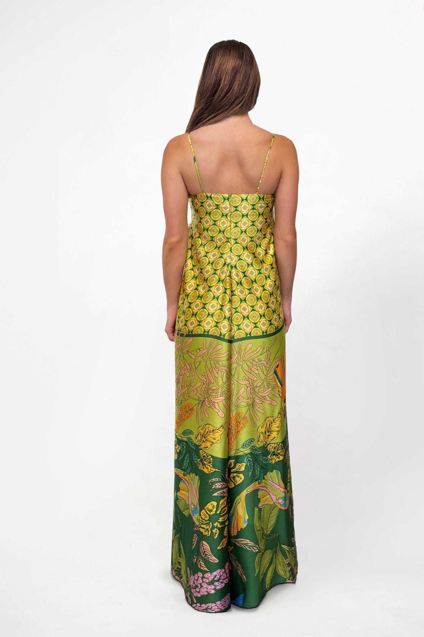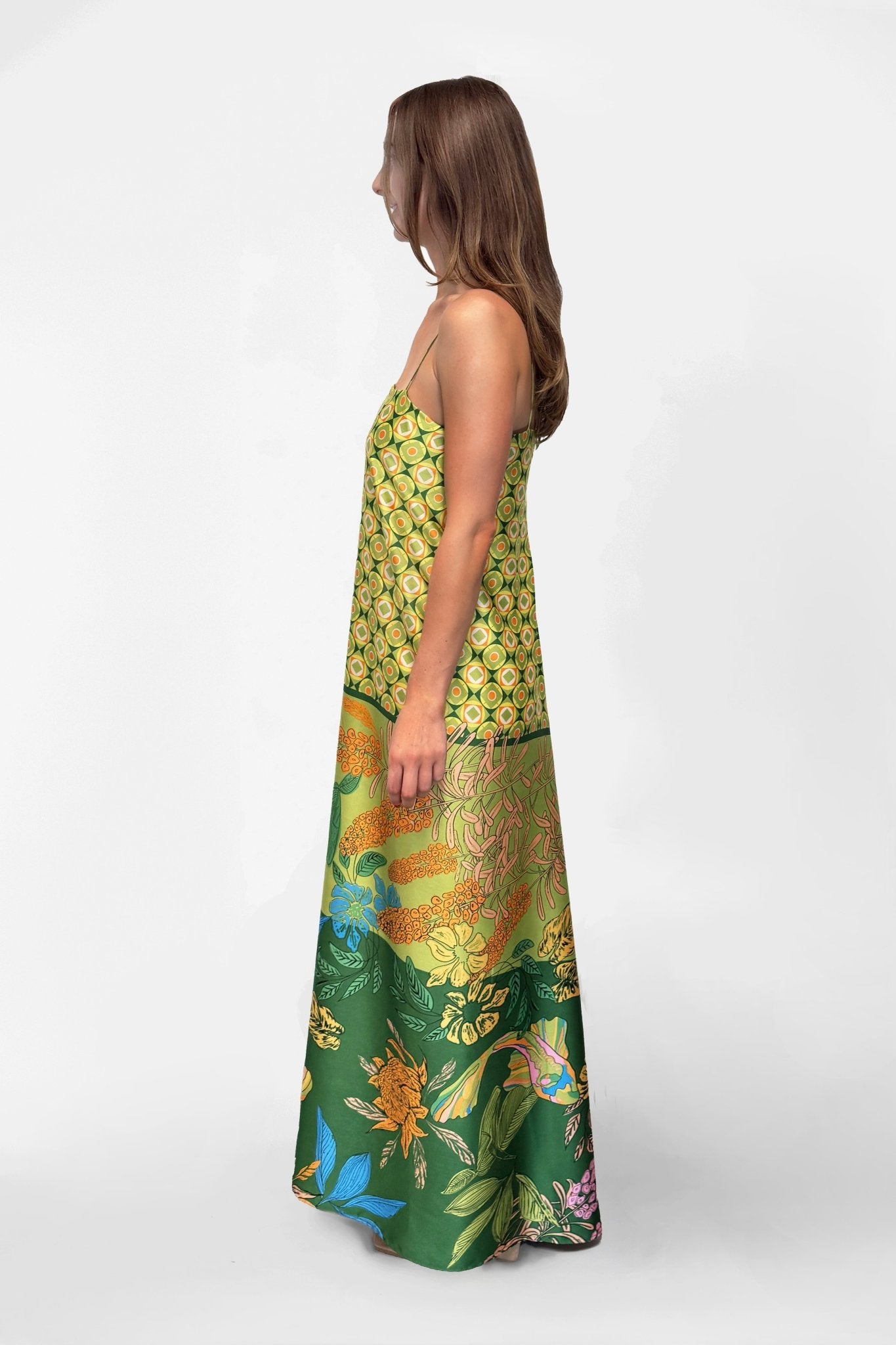 The Duplicity Slip in Koi no Nori is cut from lustrous satin patterned with a richly layered Japanese-inspired print. Delicately suspended from slender rouleau straps, the clean square neckline creates a balanced frame for the fluid silhouette. The slip skims the body with a gentle ease, before falling into a soft, ankle-grazing hem that moves effortlessly with each step.