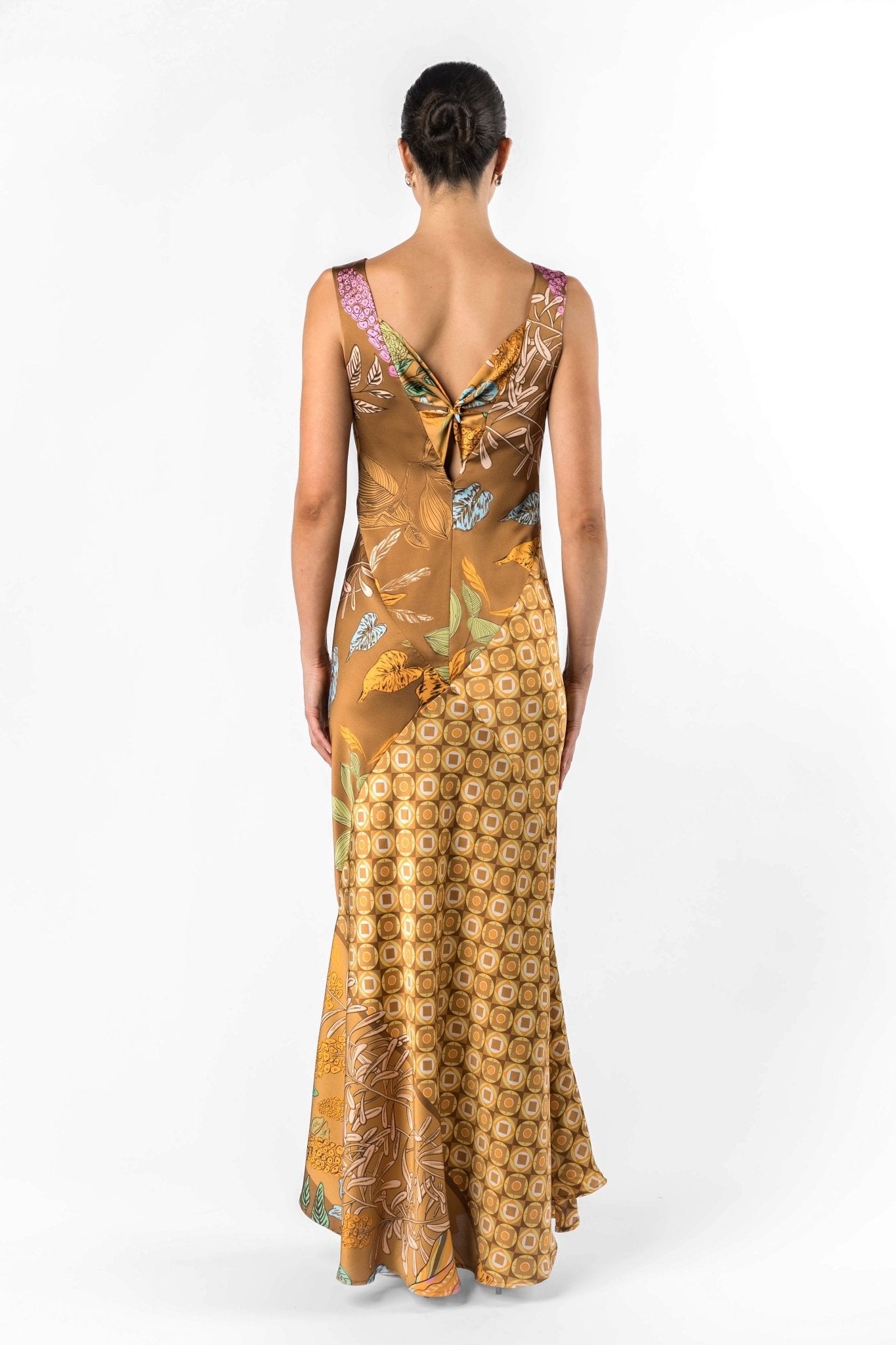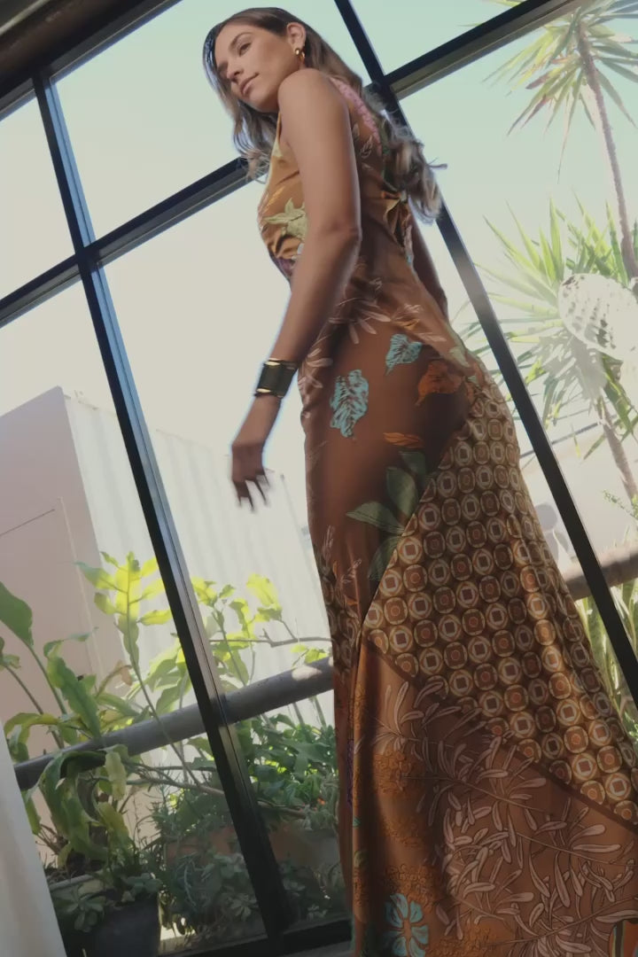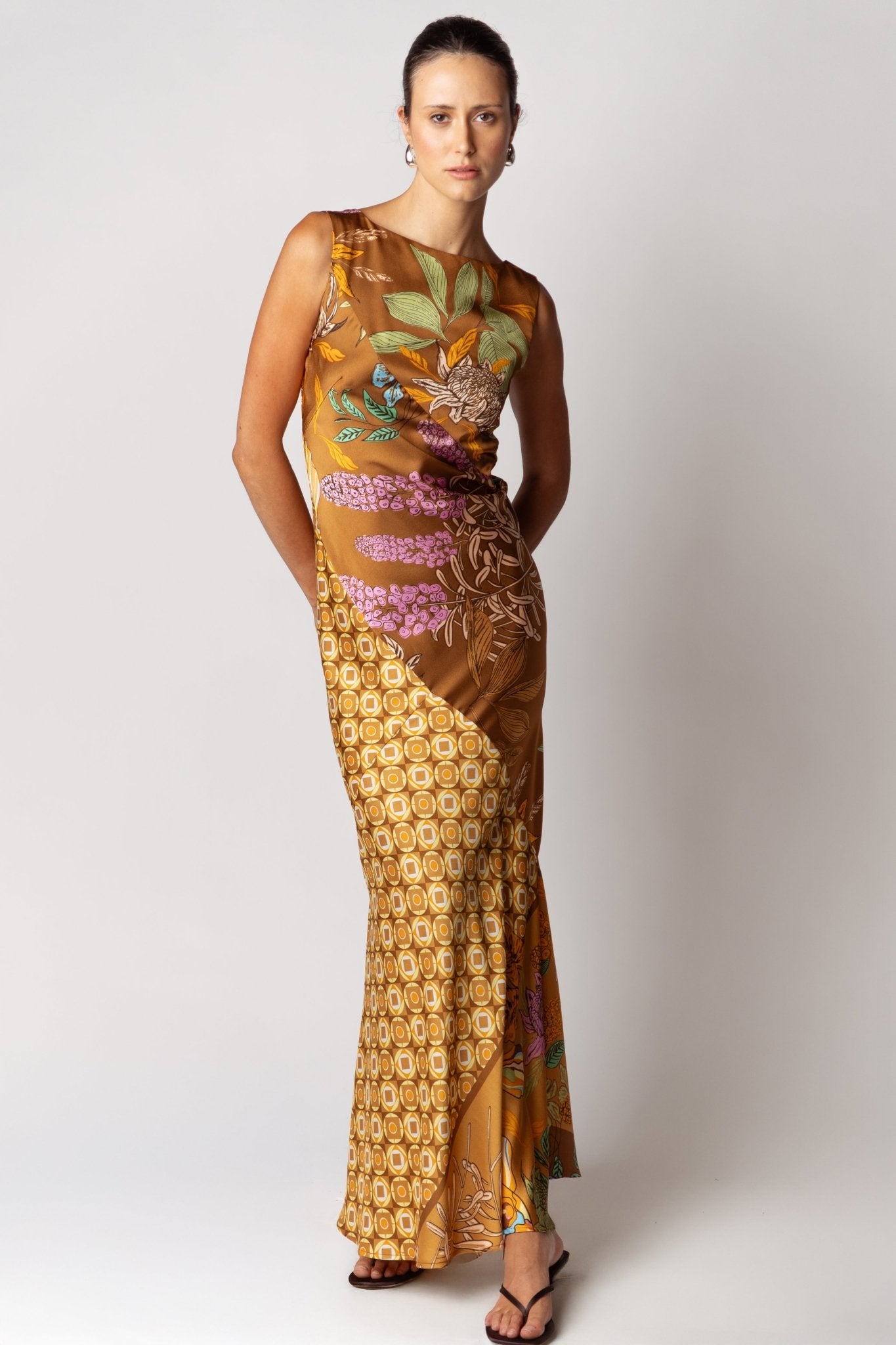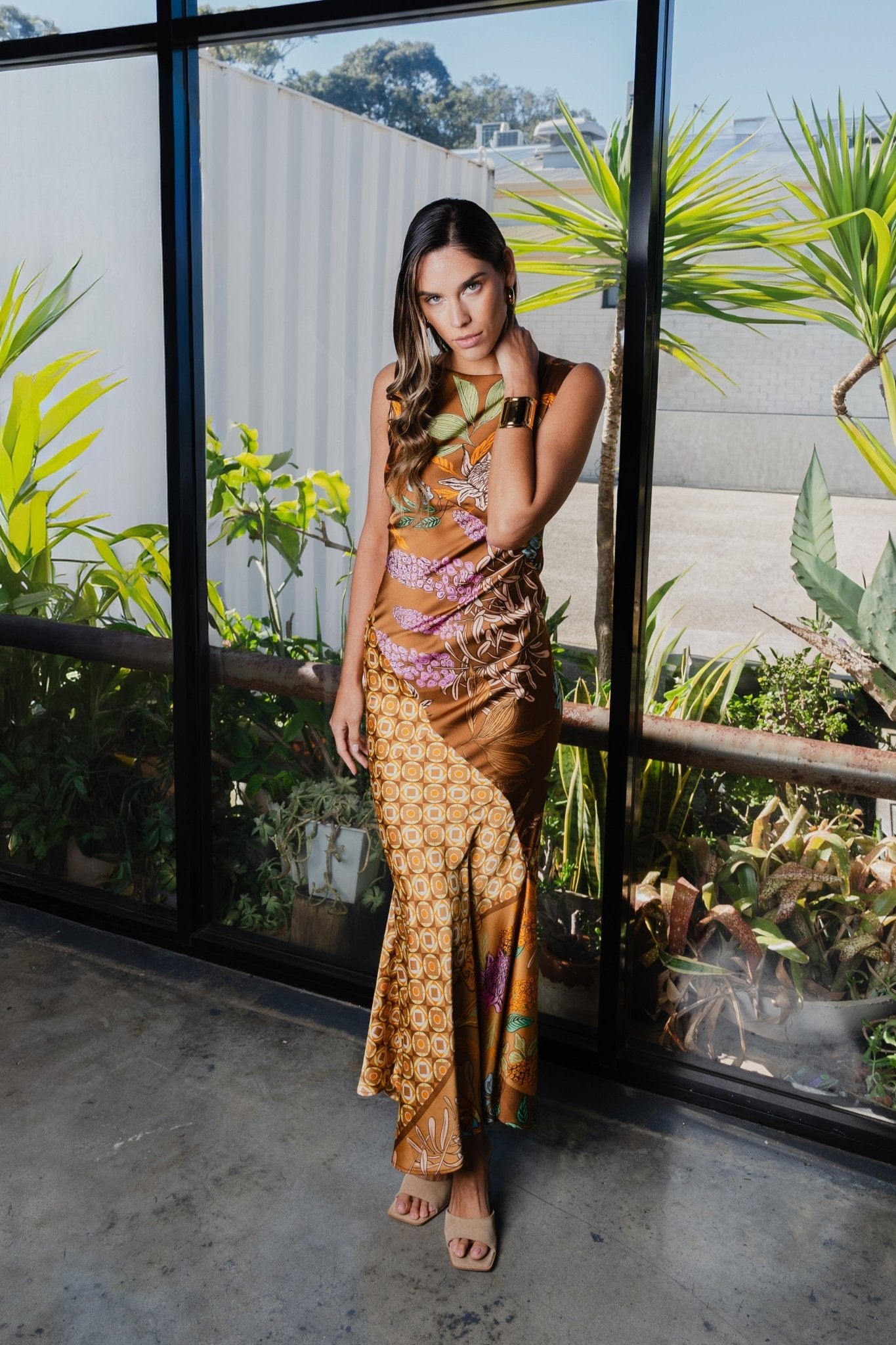 The Fleur Monica Maxi in Koi no Mori is cut from a fluid satin with a subtle sheen, designed to reflect light with every step. Featuring a square neckline and sleeveless silhouette, the gown softly skims the body before falling into a gentle flare at the hem. The structured neckline offers refined coverage, while the intricate floral motif adds depth and movement.