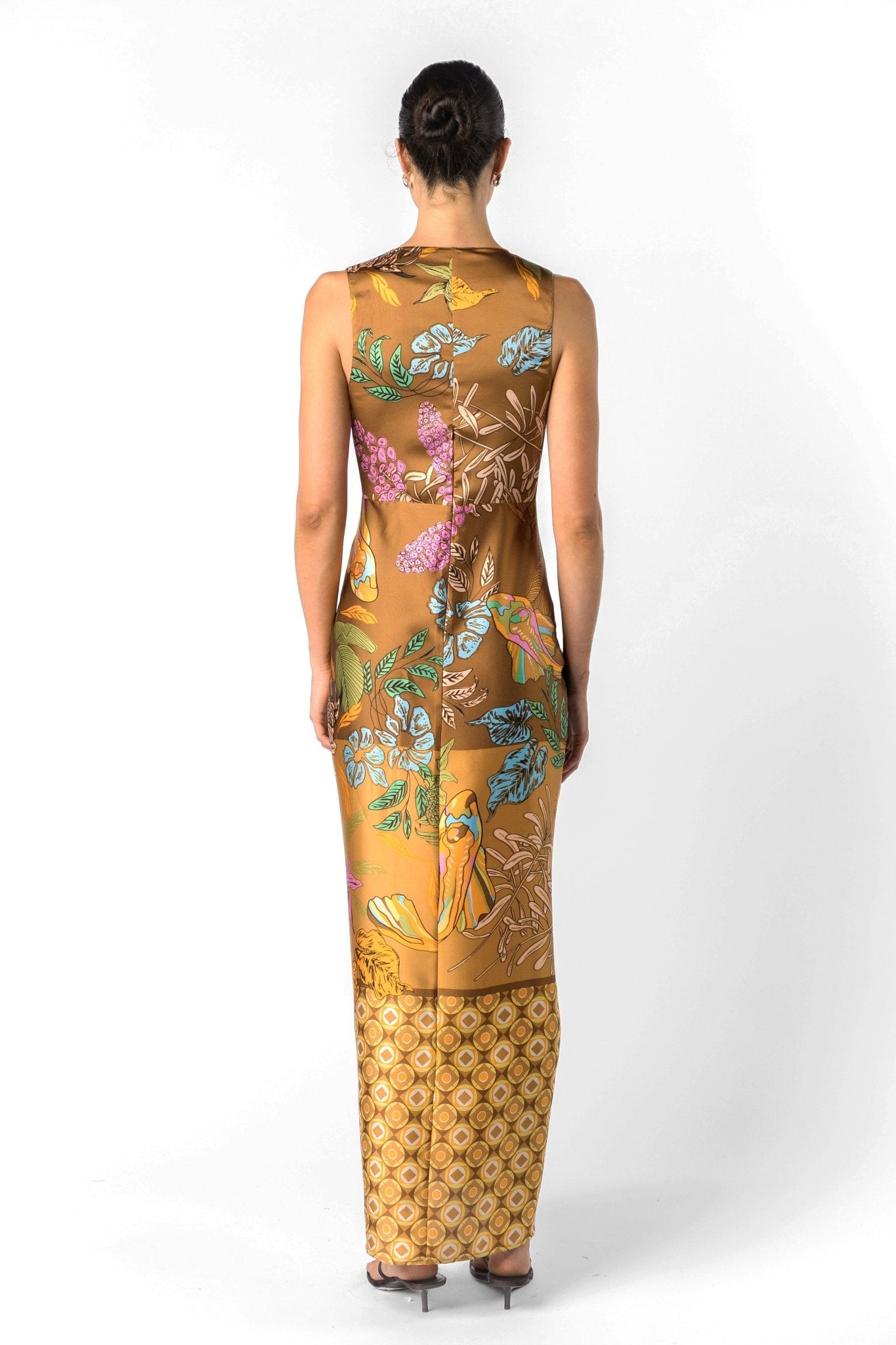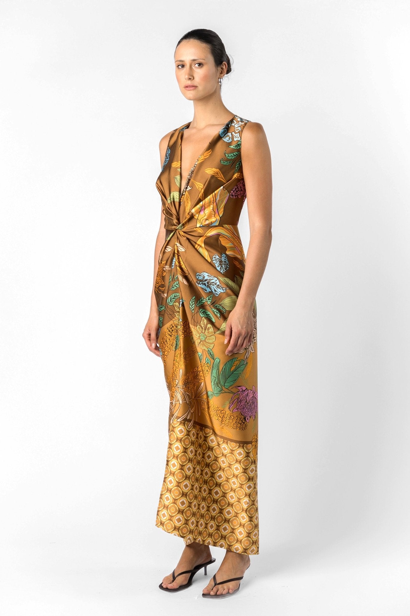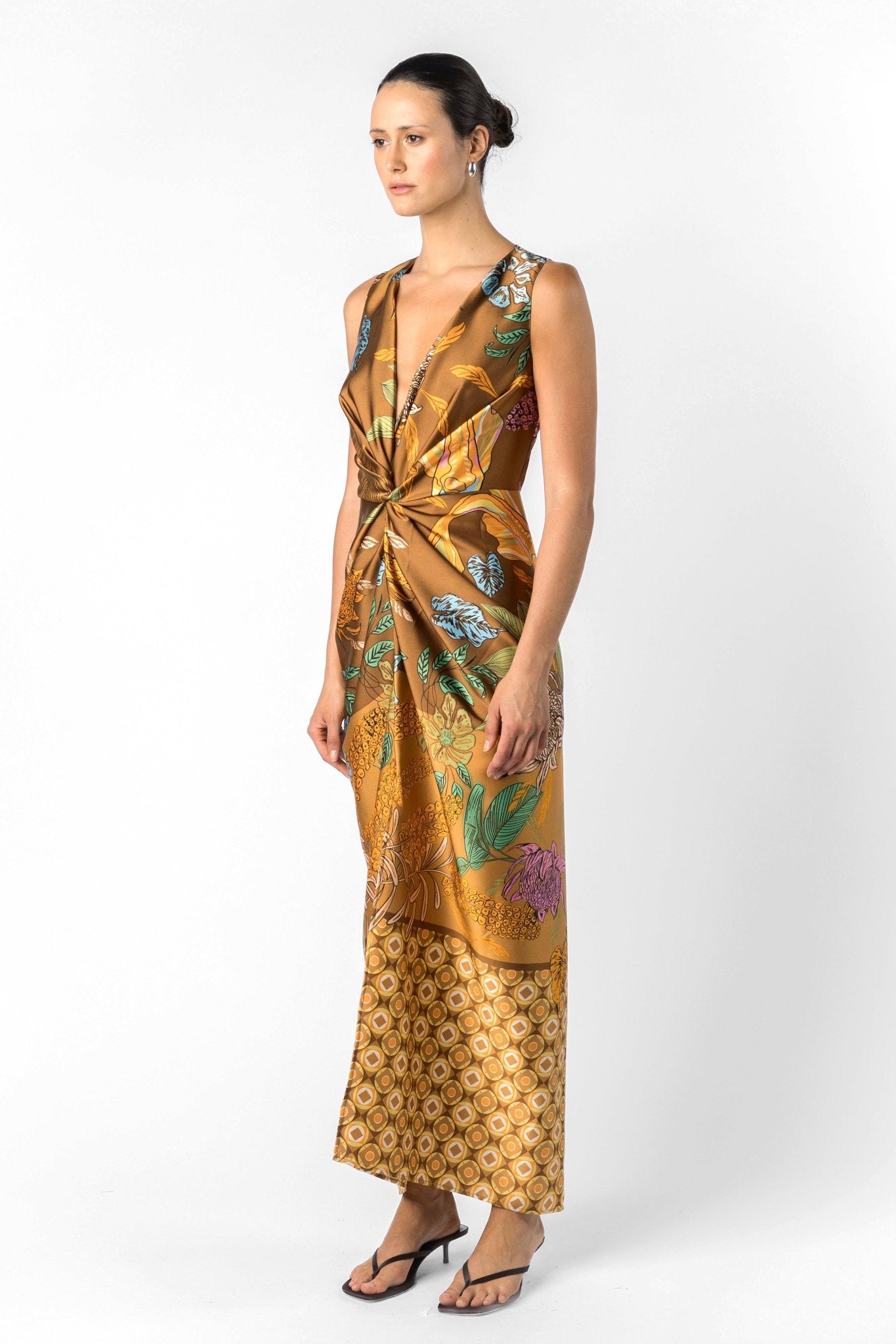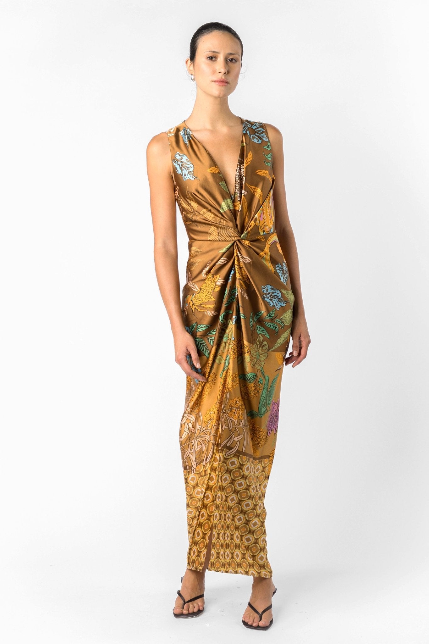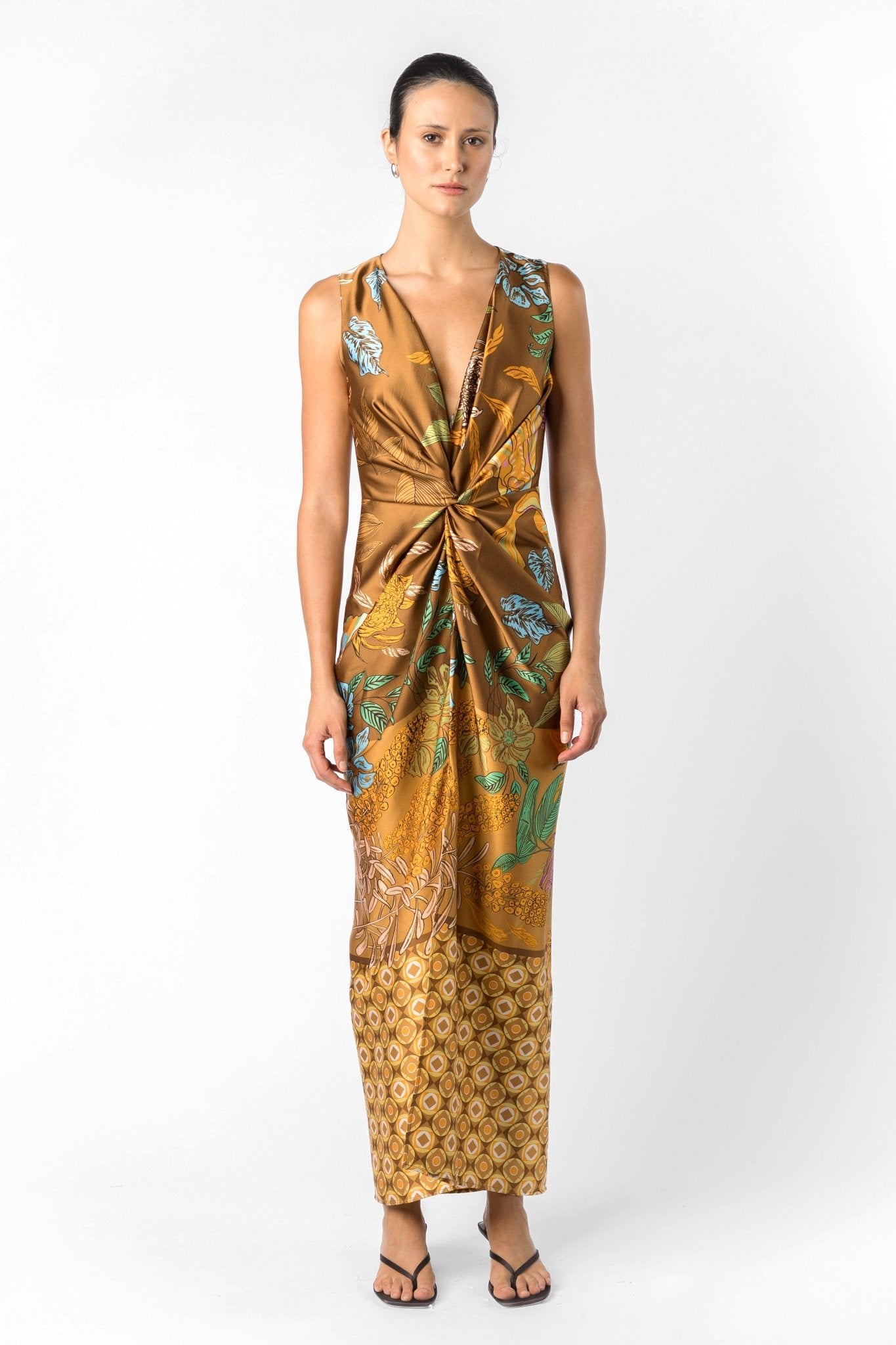 The Gaia Dress in Koi no Mori showcases a fluid, sculptural silhouette brought to life through artful draping and a rich printed satin. Featuring a deep V neckline and a central twist detail, the dress cinches the waist before falling into a straight-cut skirt with an understated front split. The nature-inspired print in warm amber tones is layered with illustrative flora and geometric motifs, evoking a balance of tradition and modernity. A statement dress that feels both refined and unexpected.