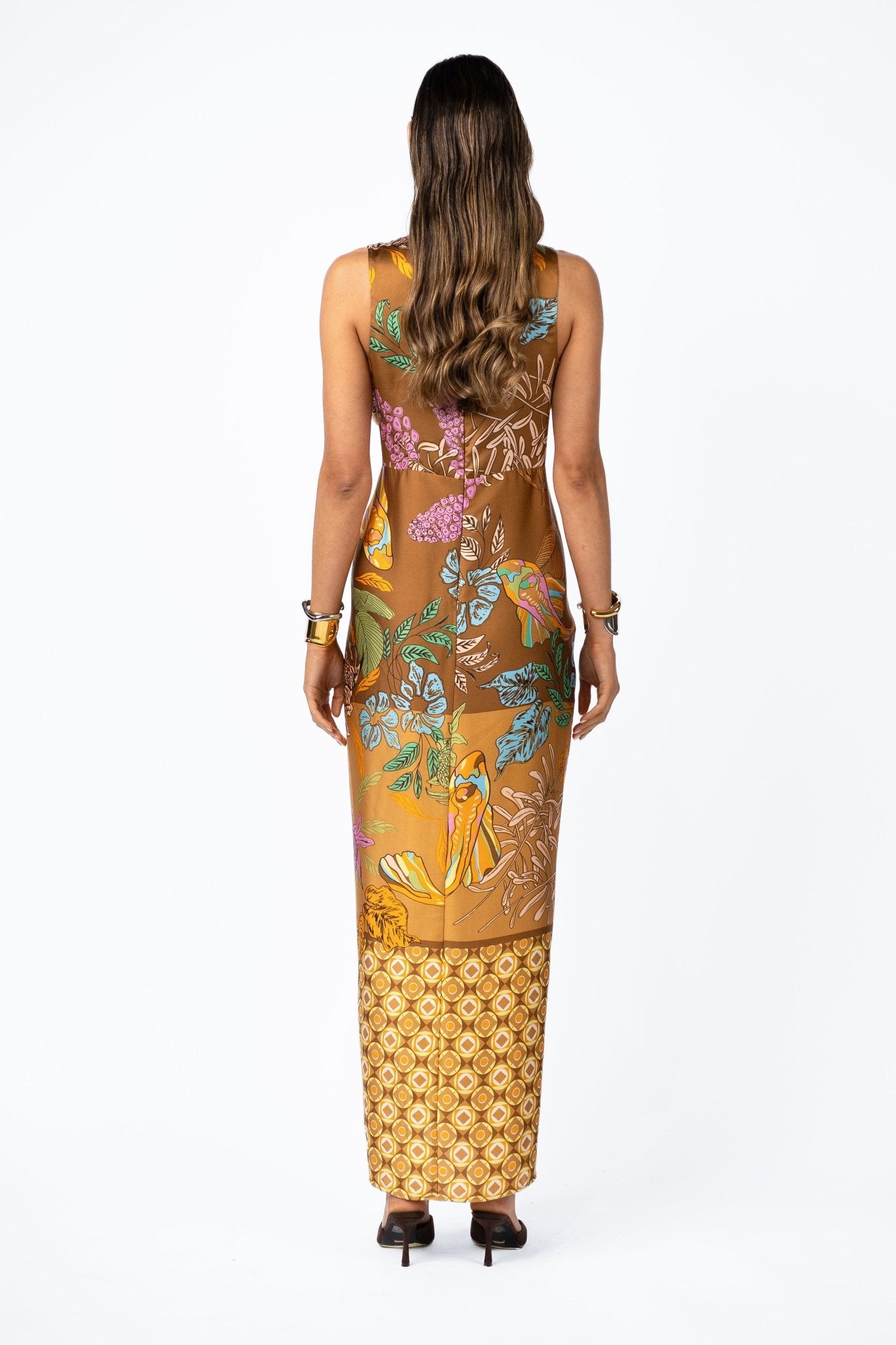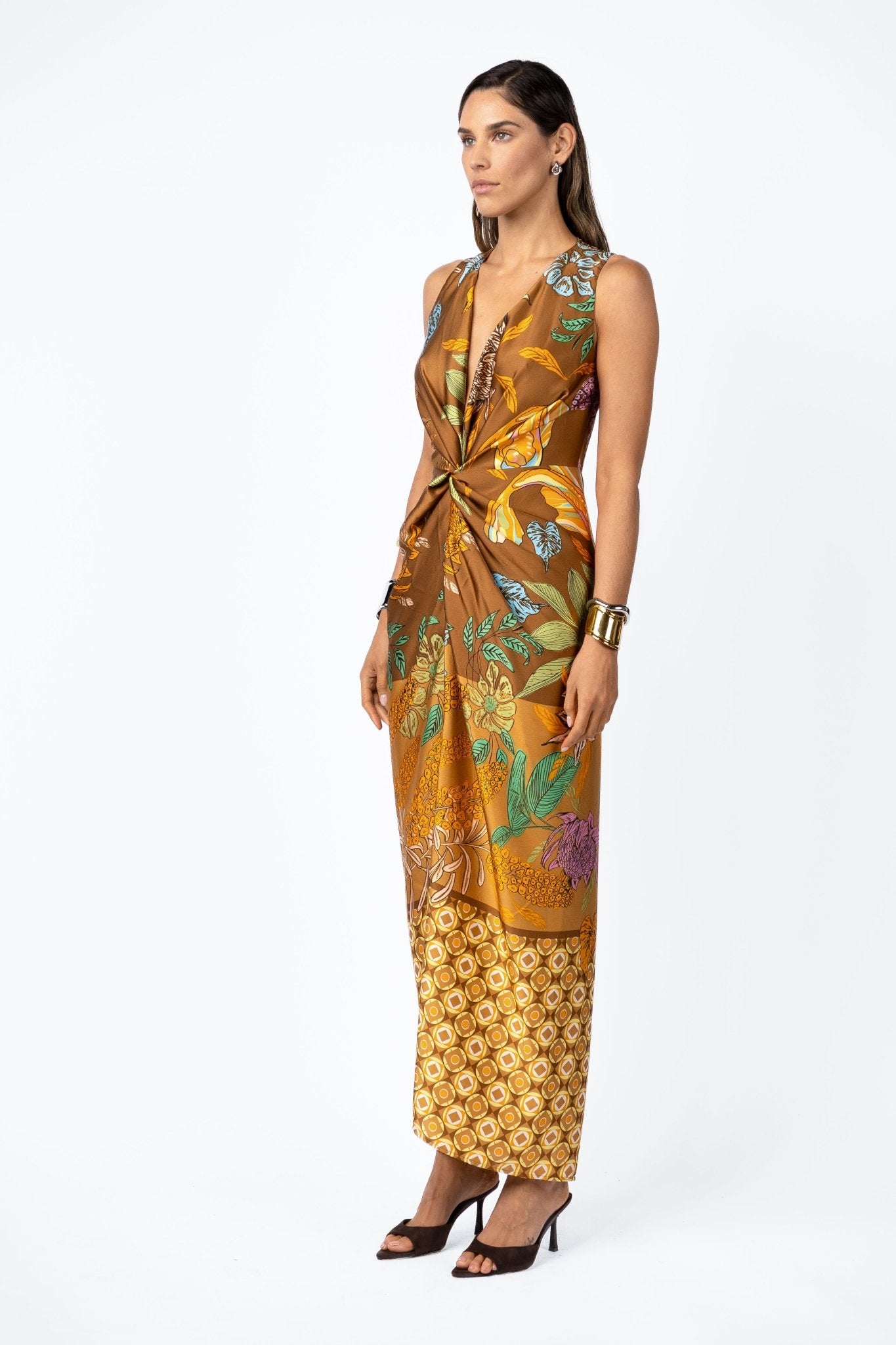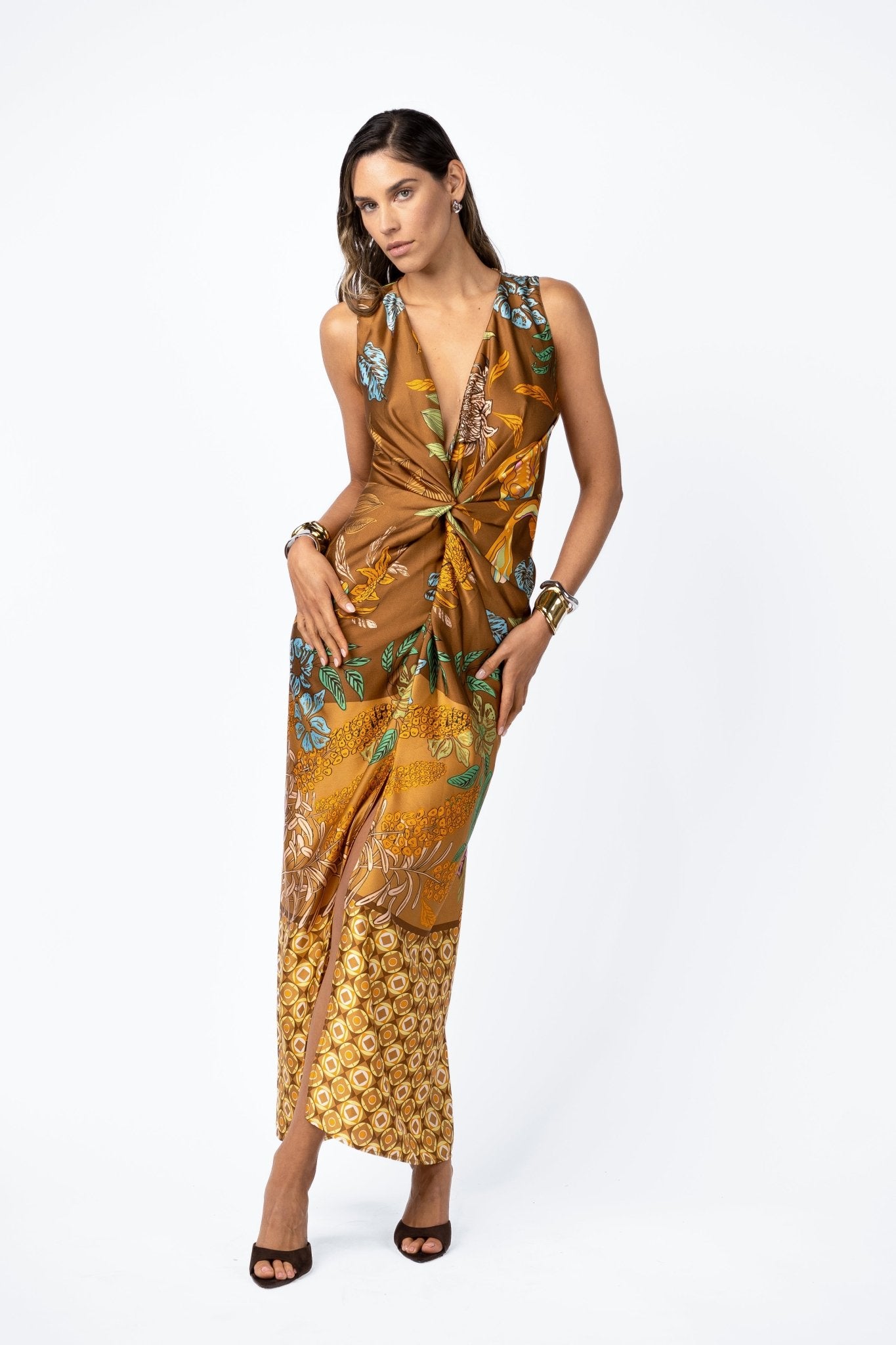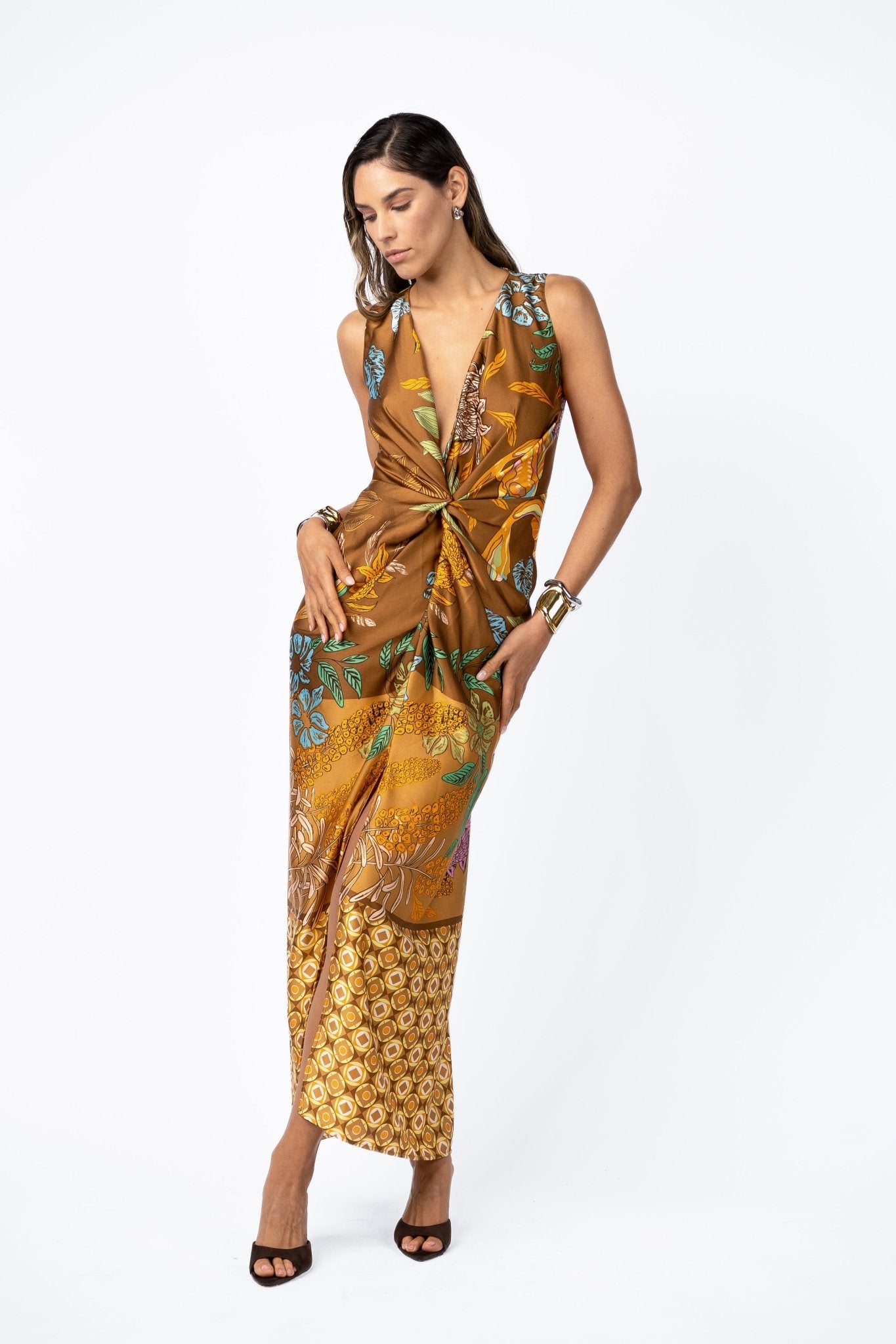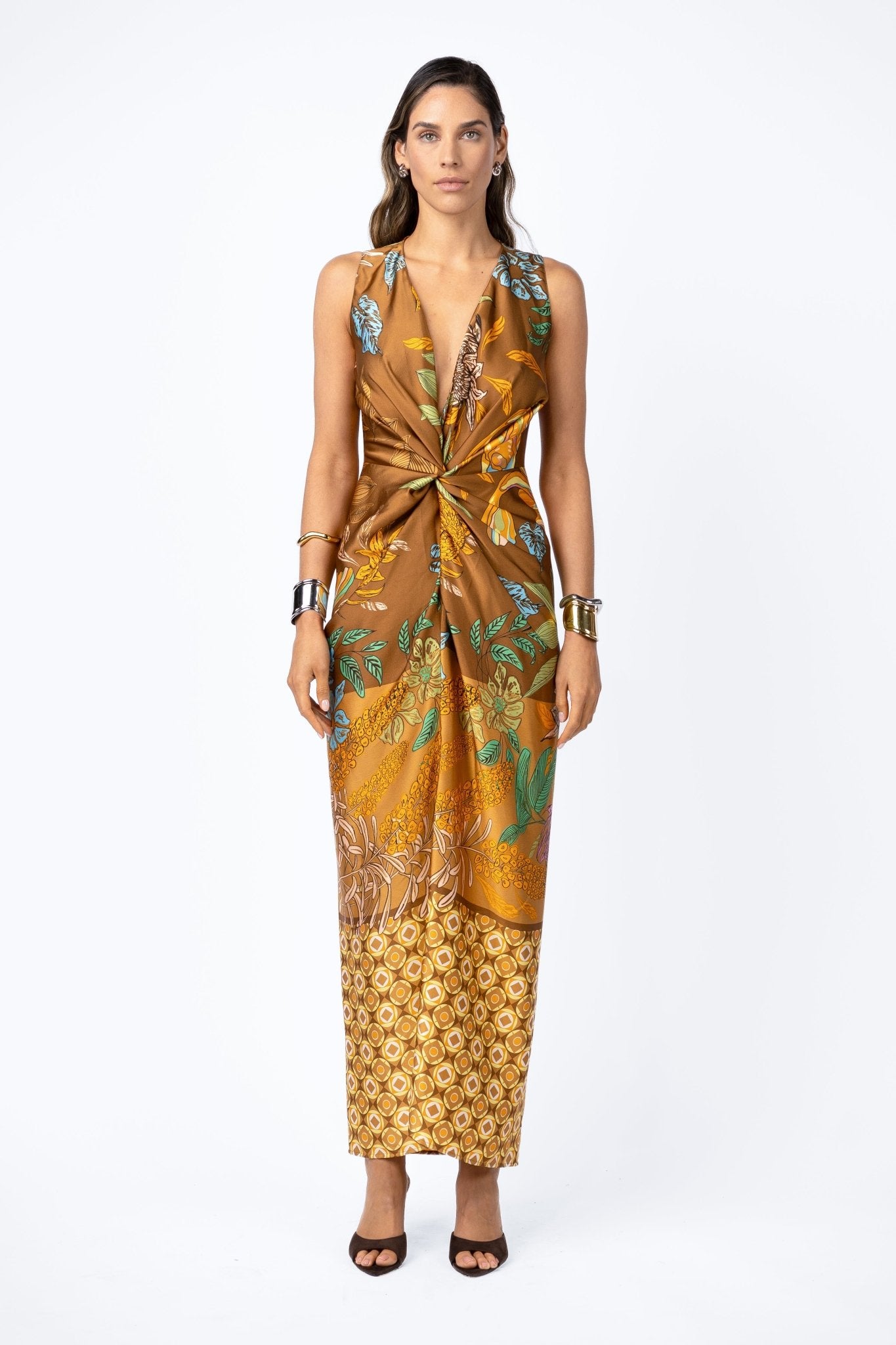 The Gaia Dress in Koi no Mori showcases a fluid, sculptural silhouette brought to life through artful draping and a rich printed satin. Featuring a deep V neckline and a central twist detail, the dress cinches the waist before falling into a straight-cut skirt with an understated front split. The nature-inspired print in warm amber tones is layered with illustrative flora and geometric motifs, evoking a balance of tradition and modernity. A statement dress that feels both refined and unexpected.