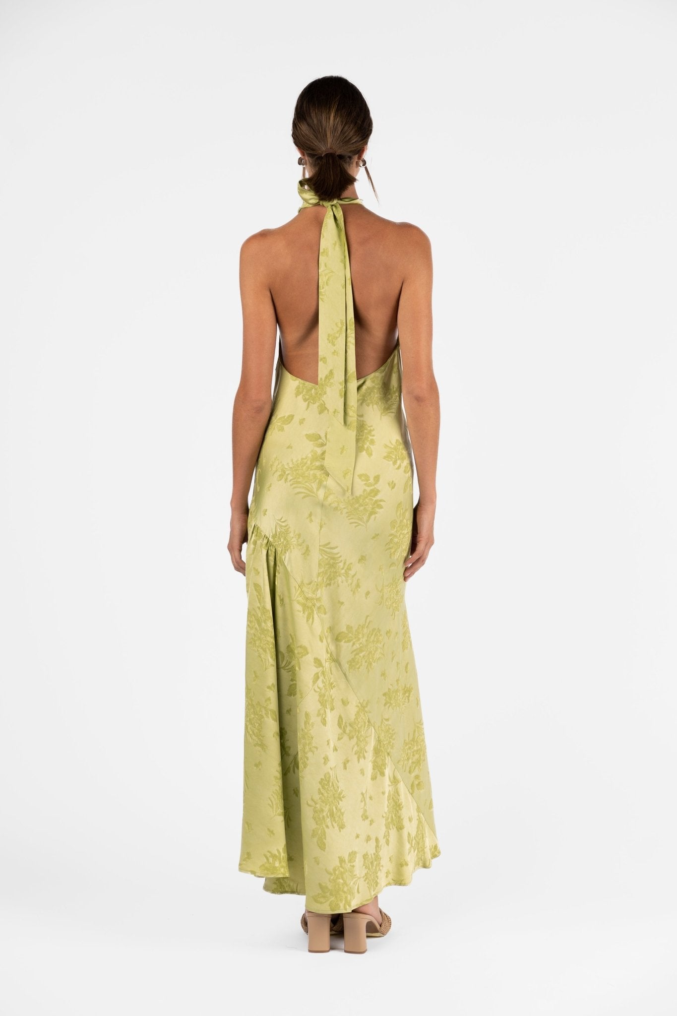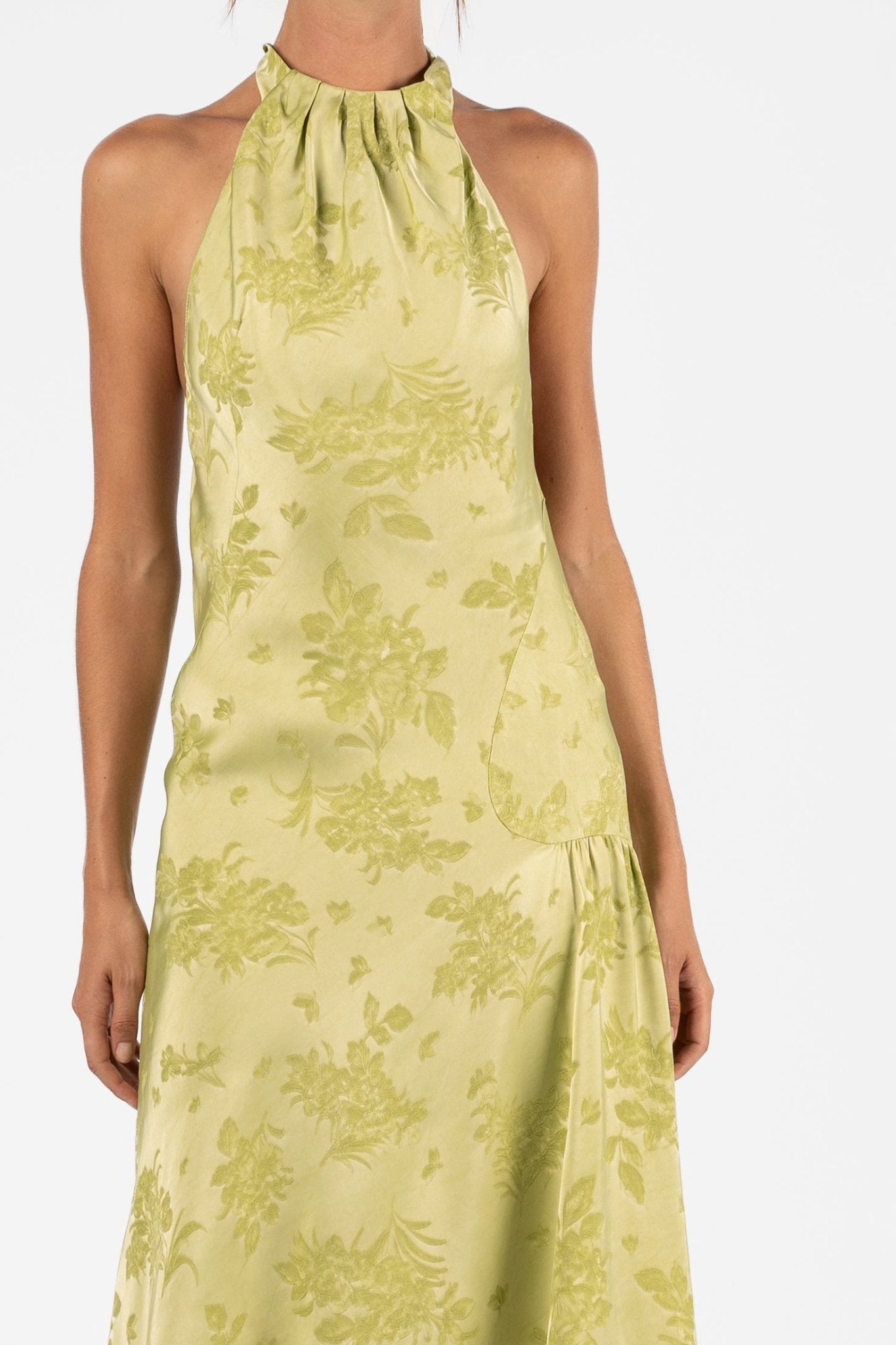 The Gemma Dress in Kimono Brocade is crafted from a structured satin jacquard with a woven floral motif that catches the light with every movement. Featuring a box-pleated halter neckline that ties elegantly at the nape, this silhouette contours through the bust and waist before softly flaring at the hem. The result is an elongated and fluid shape that glides over the body with quiet confidence.