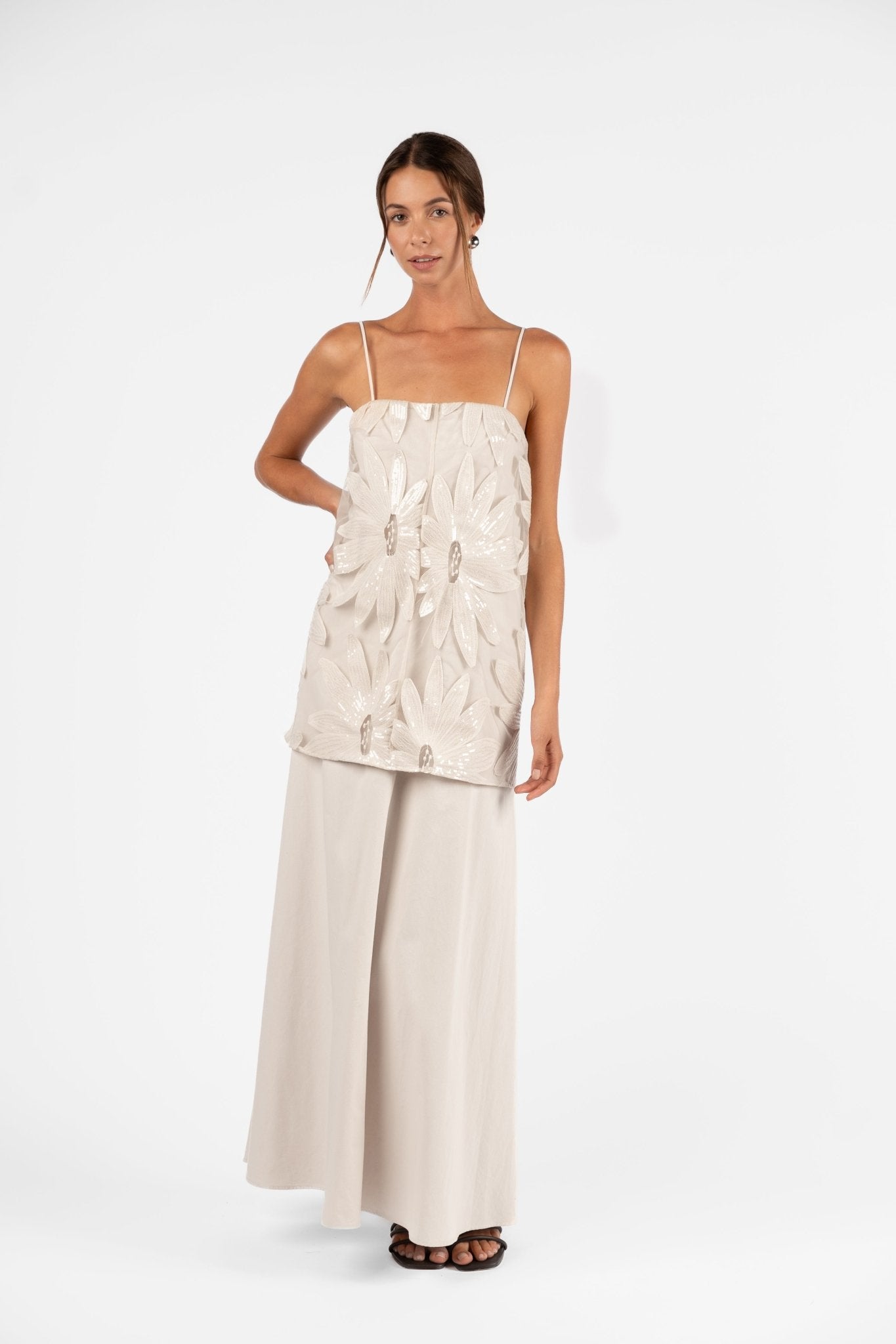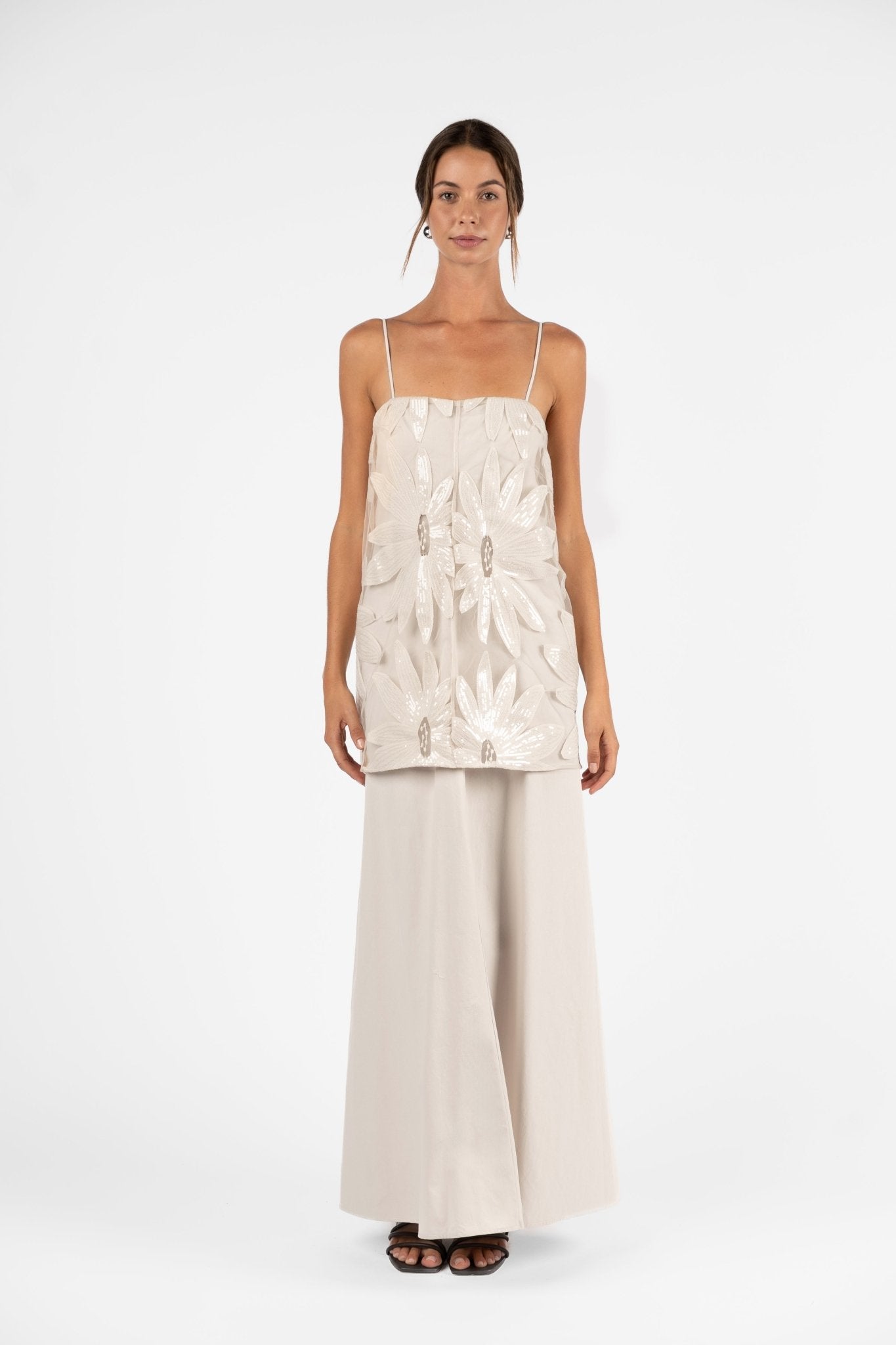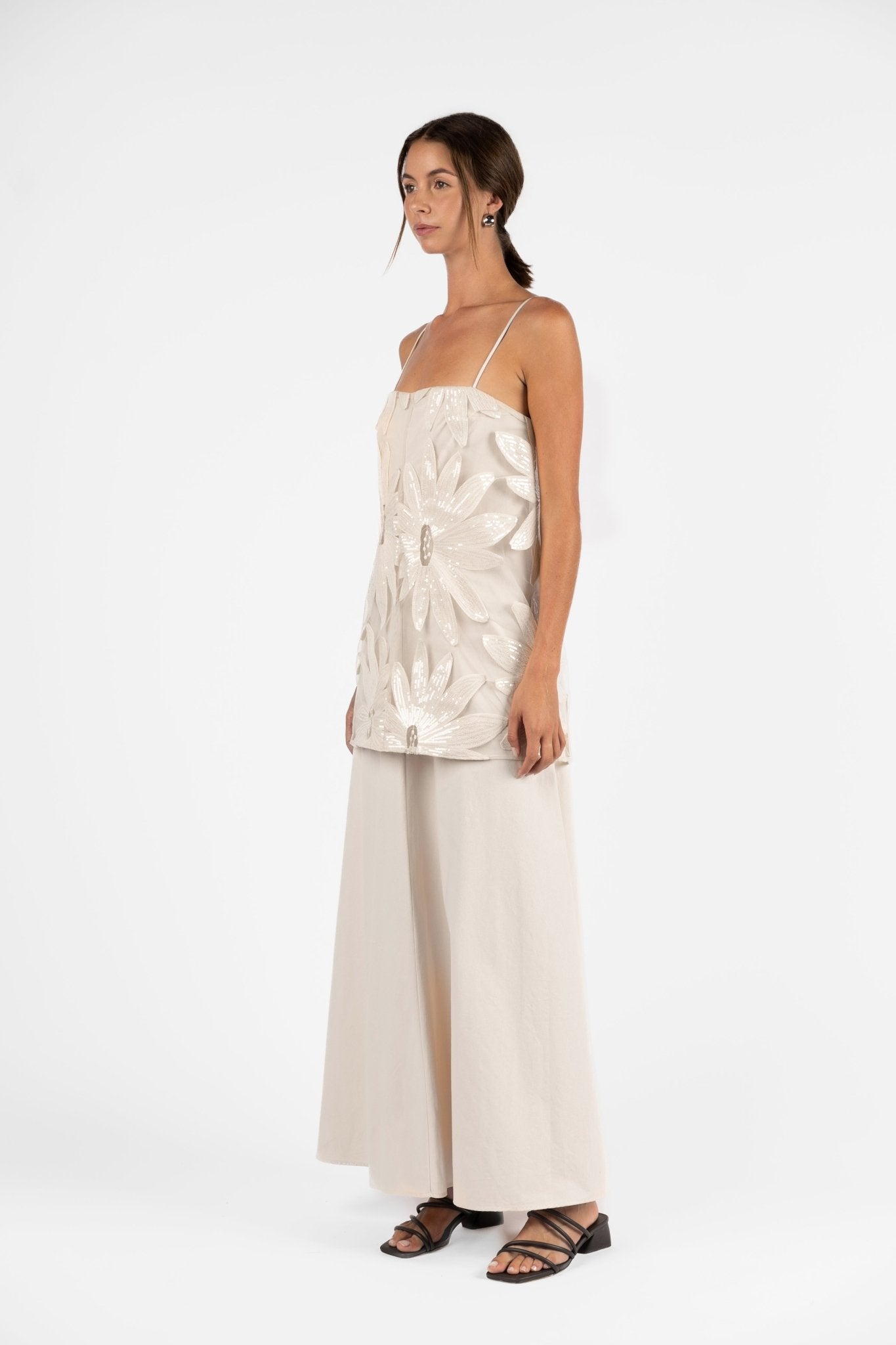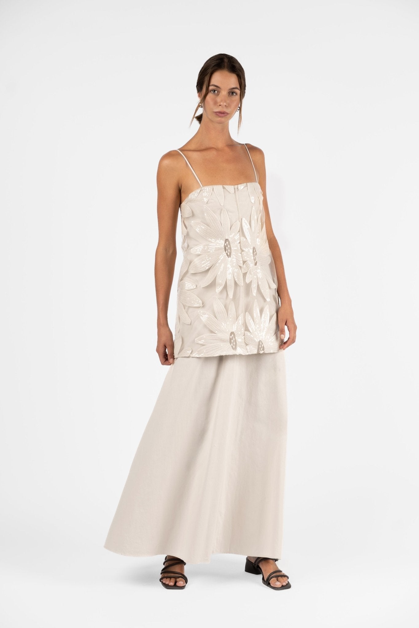 The Tear dress in Nippon Daisy / Cloud combines a softly structured shift style dress with a sheer embroidered overlay. The bodice features a delicate organza layer adorned with oversized floral motifs, suspended from fine rouleau straps for a light, refined finish.