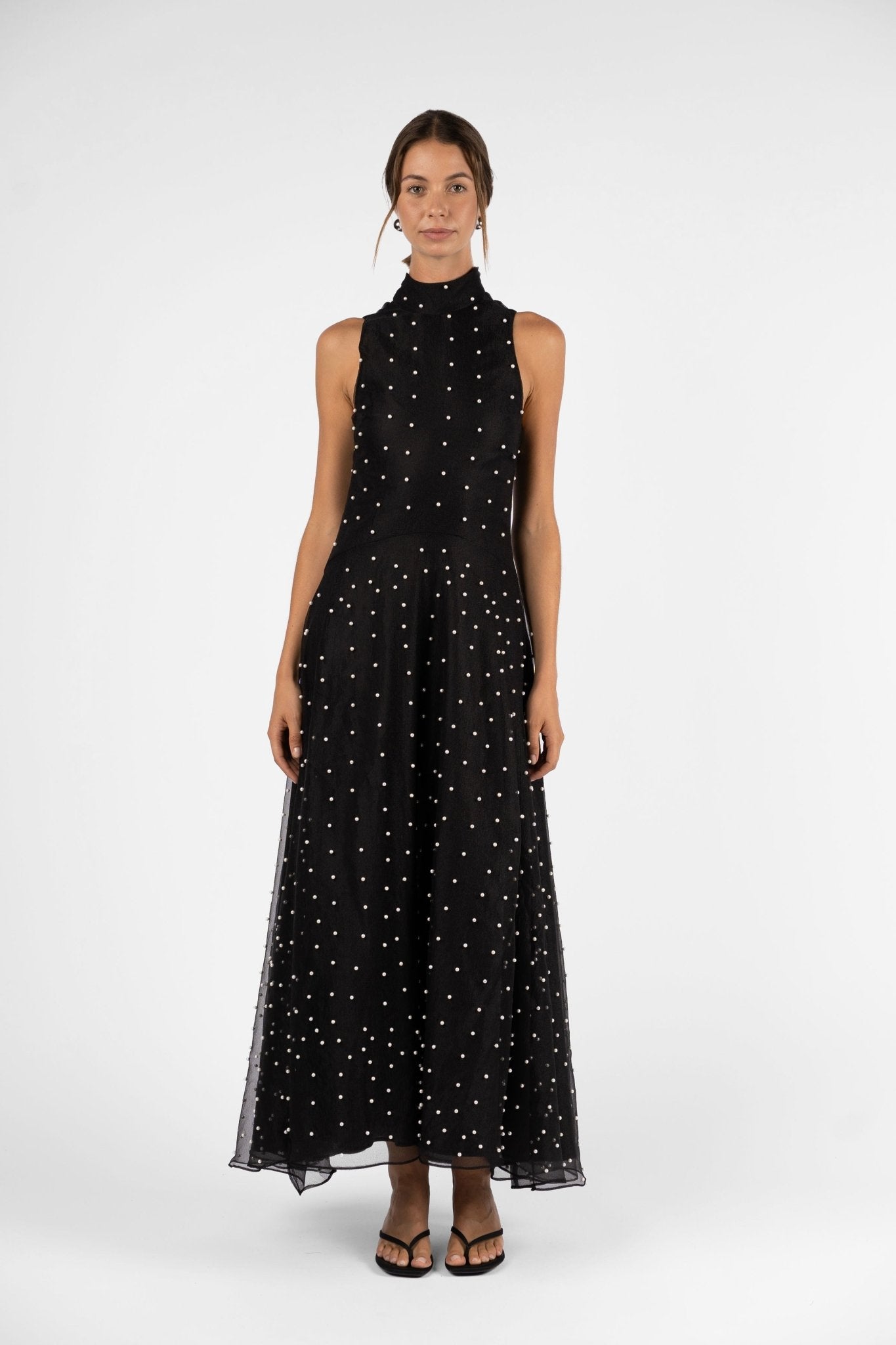 The Alta Maxi in Sable Pearl captures an ethereal sense of occasion, designed as an event piece of sculptural elegance and luminous texture. Crafted from sheer organza intricately embellished with lustrous pearls, its surface catches the light in motion, evoking refined glamour. The silhouette is grounded by a structured waist and fluid, voluminous skirt, hemmed separately to enhance movement and fullness. Fully lined in breathable cotton voile for comfort and softness against the skin, this gown balances luxury with wearability. The high neckline and full bra coverage lend modern modesty to a design that feels both timeless and spectacular.
