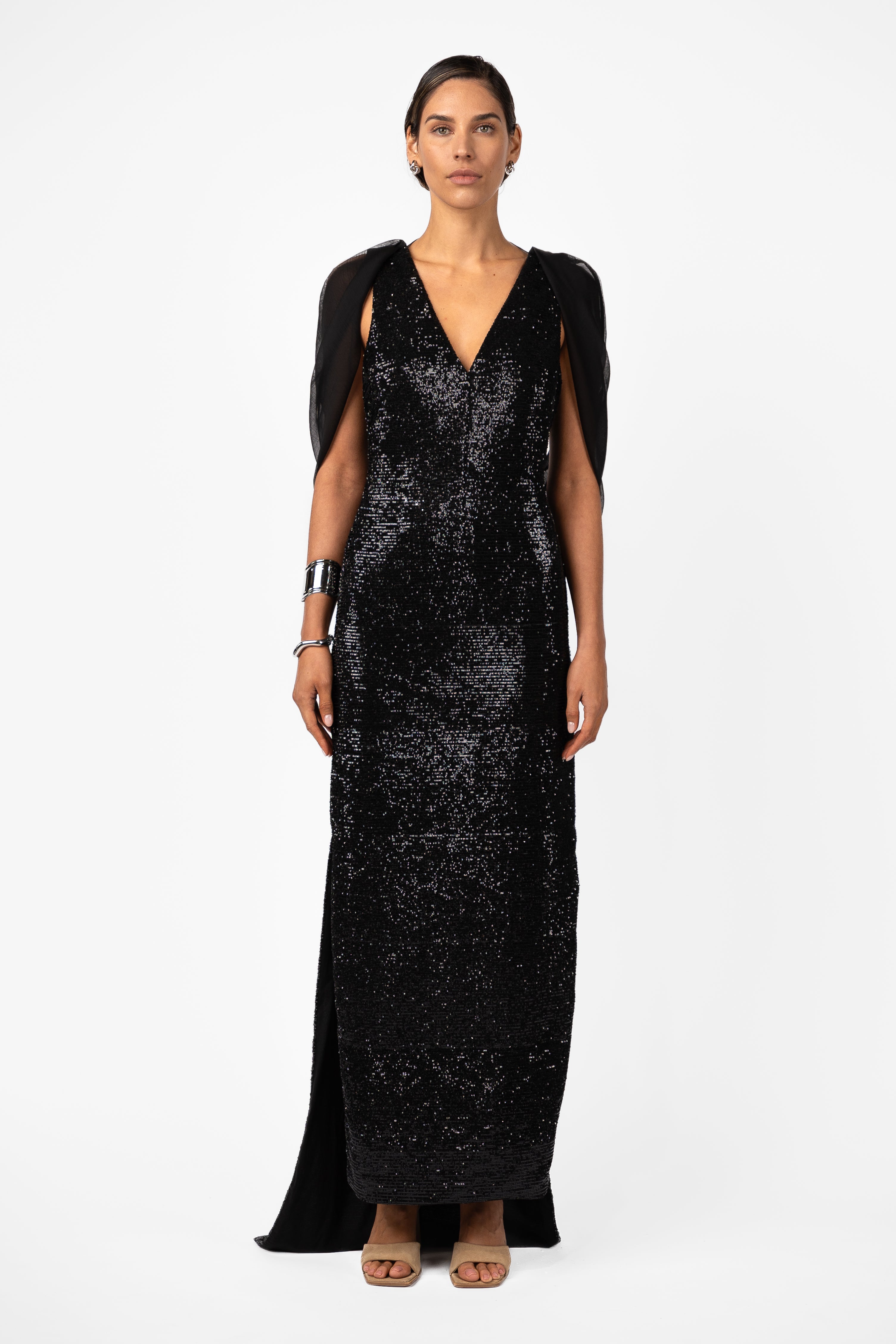 The Velare Maxi in Silhouette Black Sequin is cut in a high shine, densely embellished sequin fabrication designed to command attention with quiet confidence. Sculpted through the bodice with a clean V neckline and fluid drape falling through the skirt, this silhouette elongates the frame while maintaining a refined, effortless edge.