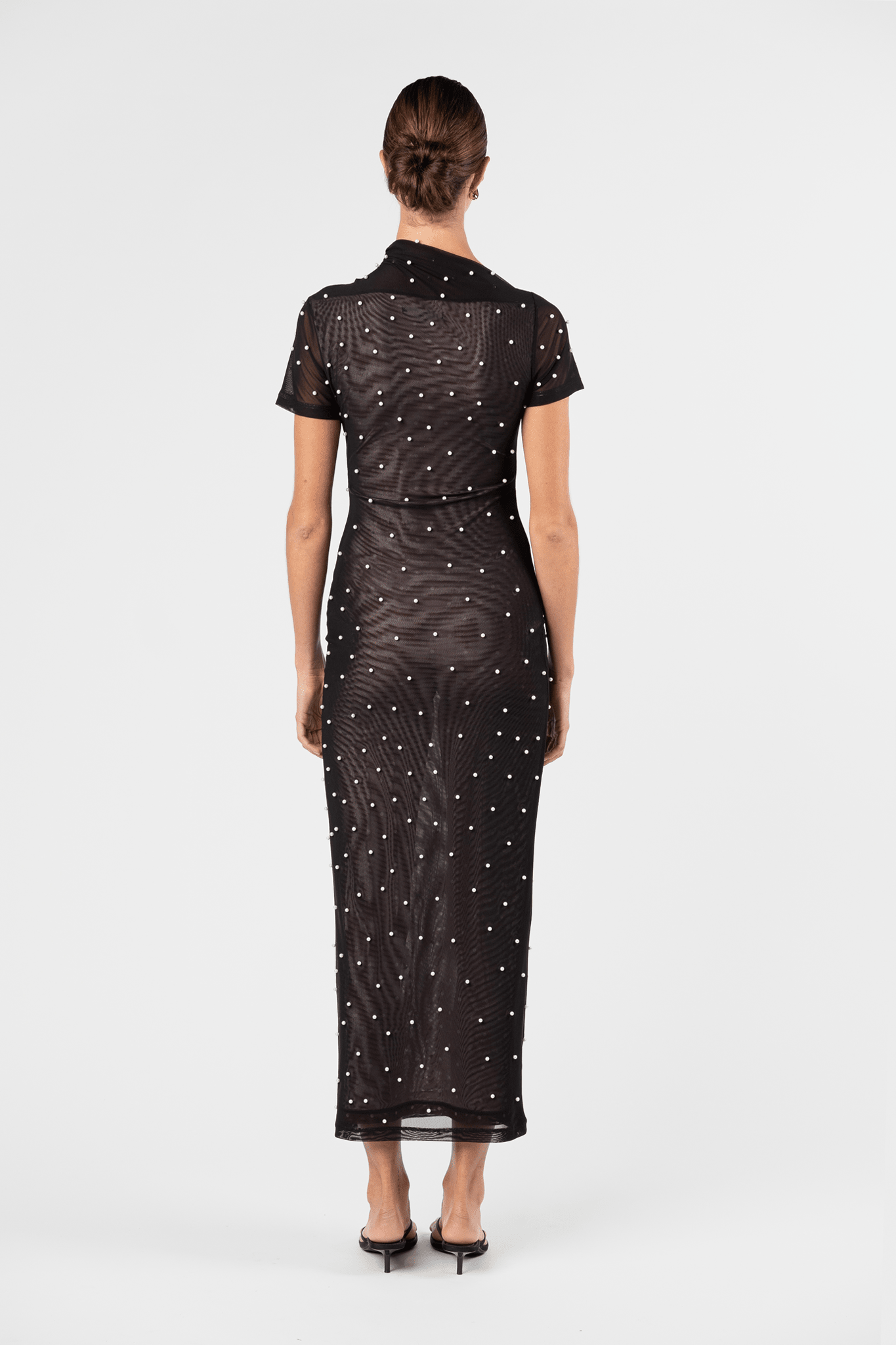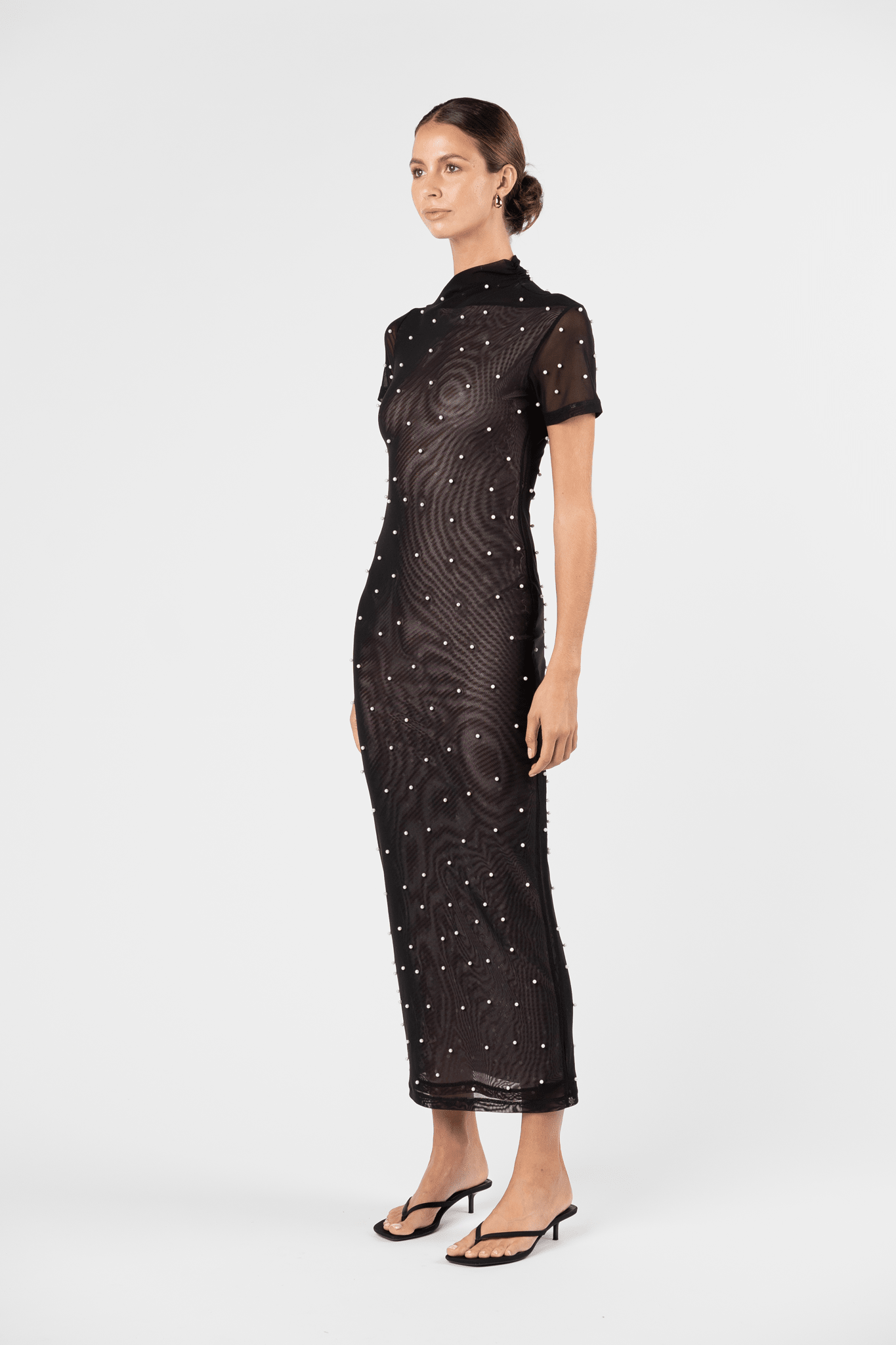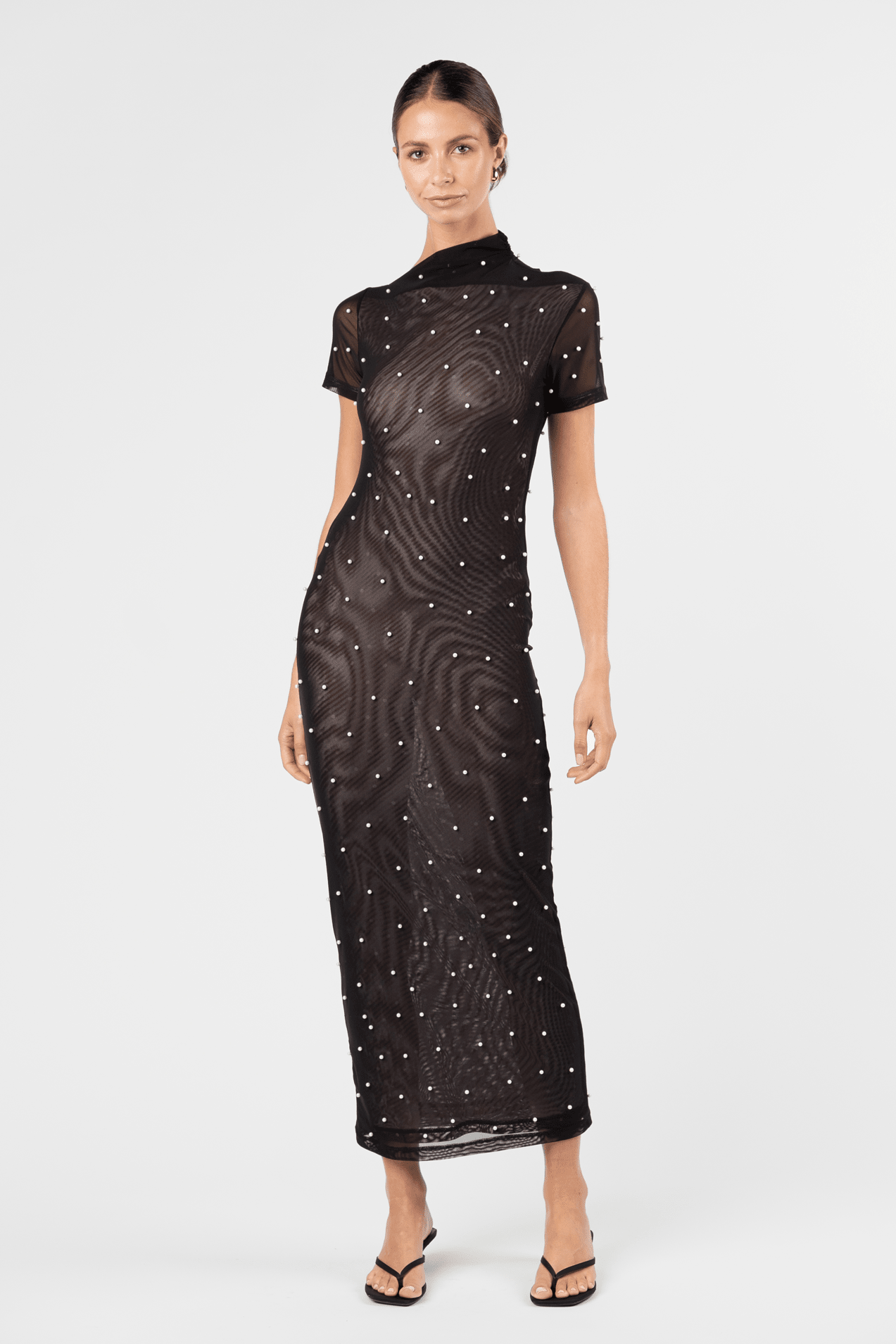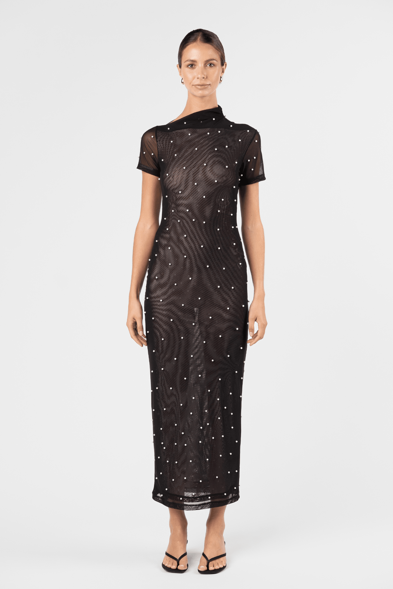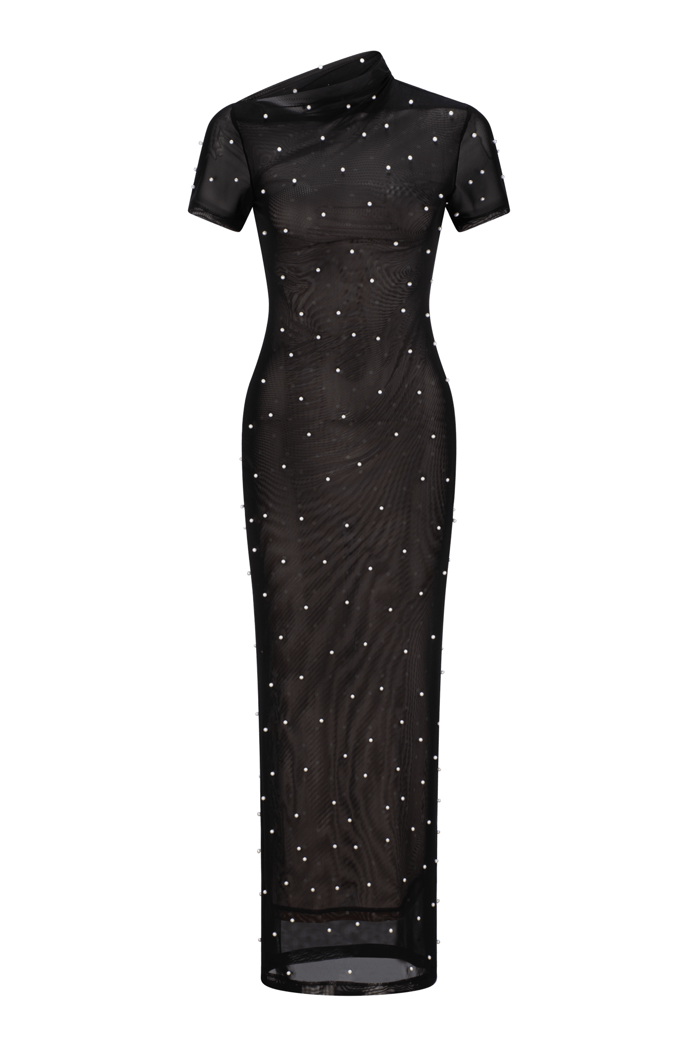 The Vortex Contour Dress in Sable Pearl reimagines the classic One Fell Swoop silhouette through a modern, embellished lens. Cut from stretch mesh adorned with delicate pearl embellishments, this form-fitting style contours the body with ease and movement. Featuring a softly structured asymmetric neckline and high collar detail, the Vortex is both contemporary and refined — a statement evolution of the LBD.