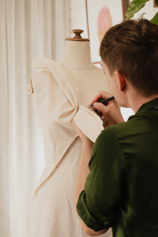 At One Fell Swoop, our design process is driven by an exploration of shape, form, and movement. We don’t follow a standard block or traditional pattern-making methods. Instead, we start by experimenting with different draping techniques, often working directly on the mannequin with calico. This hands-on approach allows us to sculpt and shape each garment from scratch, creating a fit that’s uniquely tailored to the body rather than confined by the rigidity of pre-made blocks or patterns.